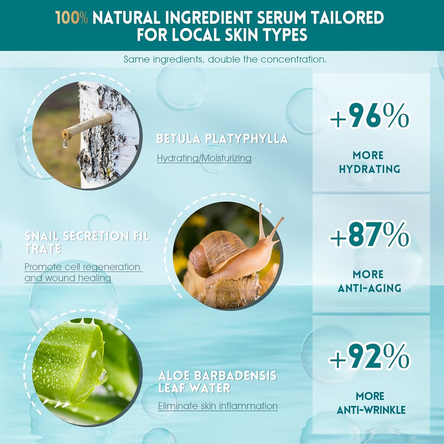- Premium Natural Ingredients: Our face serum is enriched with birch sap for hydration and brightening, snail secretion filtrate for skin repair, aloe leaf water for its redness and calming properties, and niacinamide for reducing oiliness and enhancing radiance, making it look healthier and more resilient.