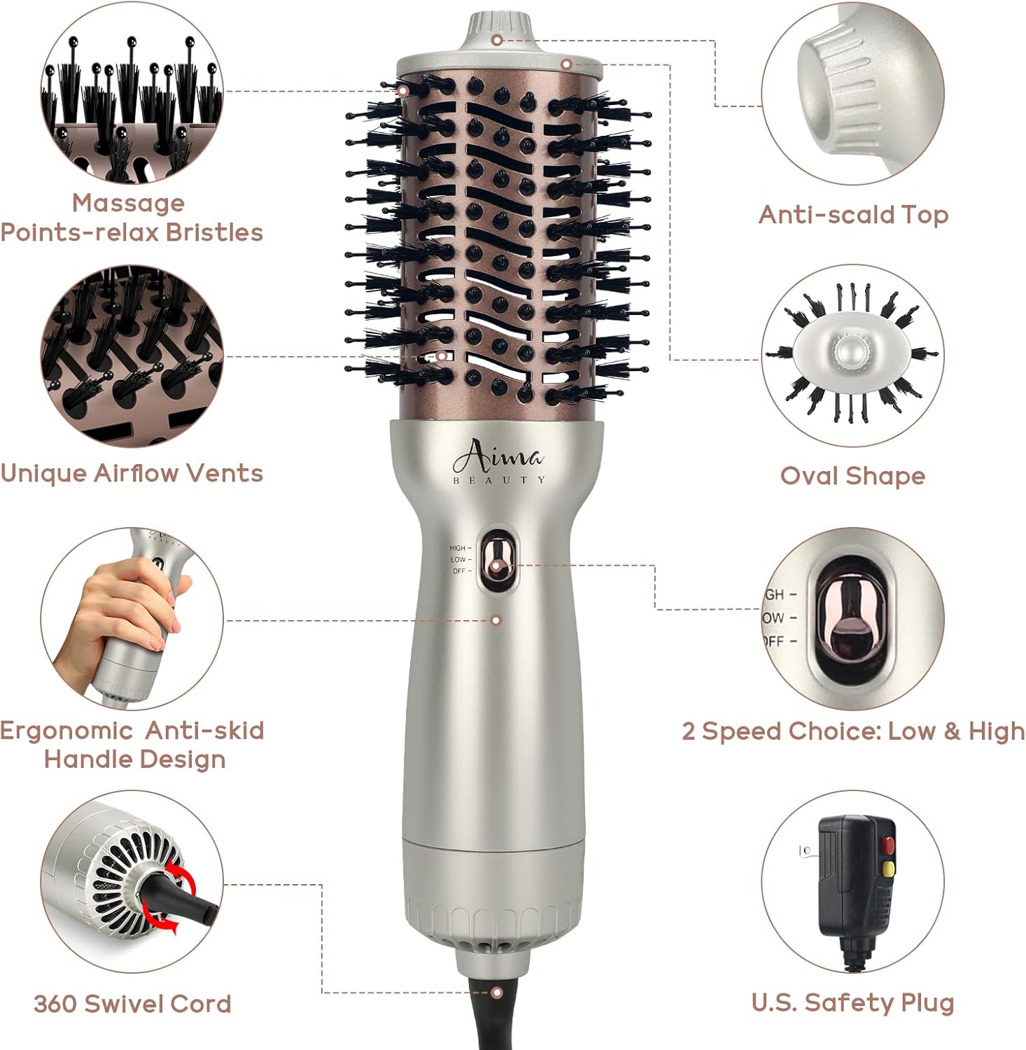 Aima Beauty 4 in 1 Worldwide Travel Hot Air Brush Dual Voltage Blowout Brush Oval Shape 110V-120V/220V-240V Straightener Blow Dryer Brush Ionic Lock Moisture Gift 360° Swivel Cord Champagne Silver