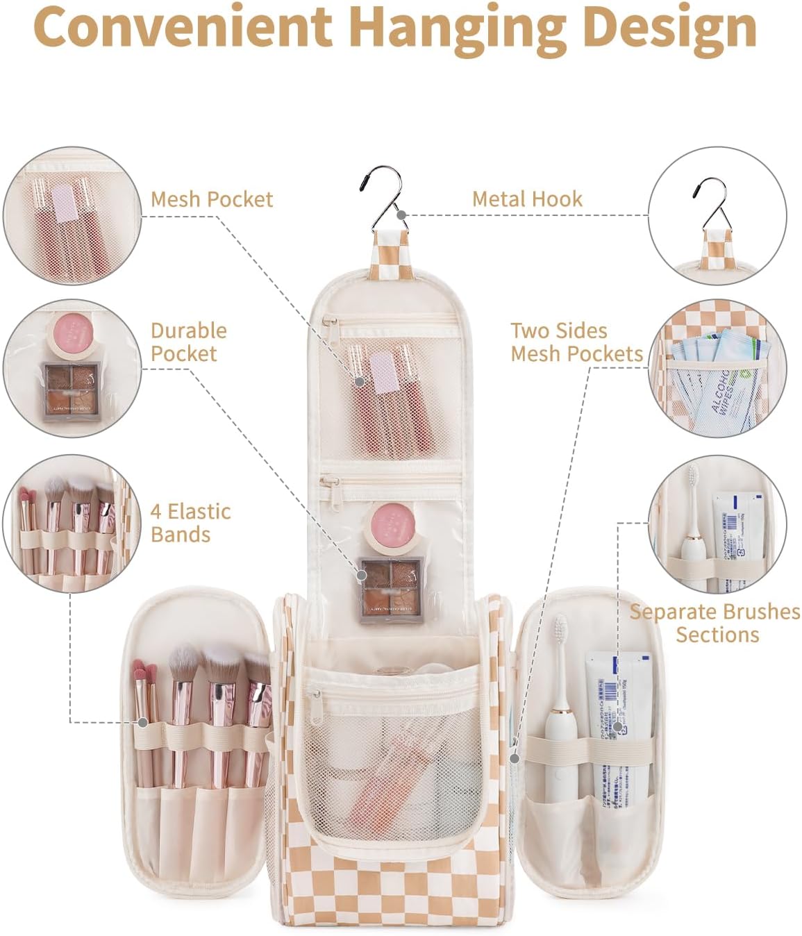 Narwey Small Checkered Hanging Travel Toiletry Bag for Women, Travel Bag for Toiletries, Makeup Bag Organizer Cosmetic Bags Make Up Bags for Women (Light Checkerboard)