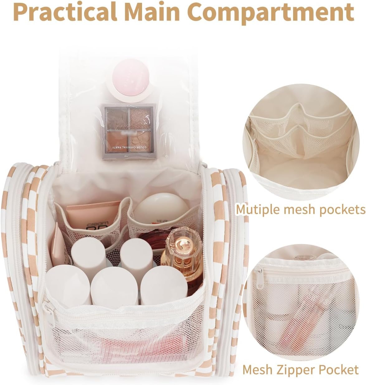 - DETAILS ORIENTED - Buit-in large metal hook allows hanging the toiletry case from towel rack, coat hook or whereever is available, making your toiletries and cosmetics displayed well for easy access, saving bathroom counter space as well. Water-resistent and durable fabric protects your gear from spills. Soft fabric and reliable zippers. Wide opening and rectangle shape makes it easy to stand on its own