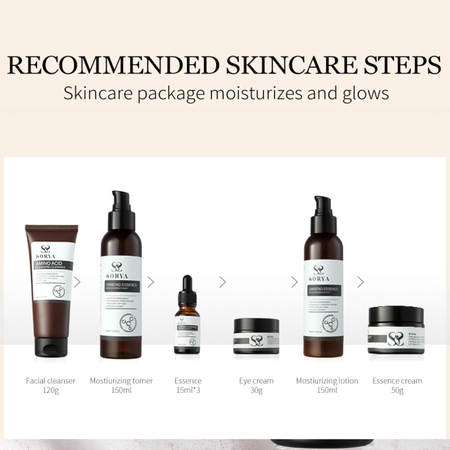 - SORYA 8 in1 Set Korean Red Ginseng Skin Care Set: Each skin care set comes with a infused Facial Toner, Eye Cream, Skin Lotion, Water Based Serum, Deep Cleaner, Hydrating Gel, and Skin Softening Serum to hydrate, moisturize, and pamper your skin while being gentle to help to prevent dryness