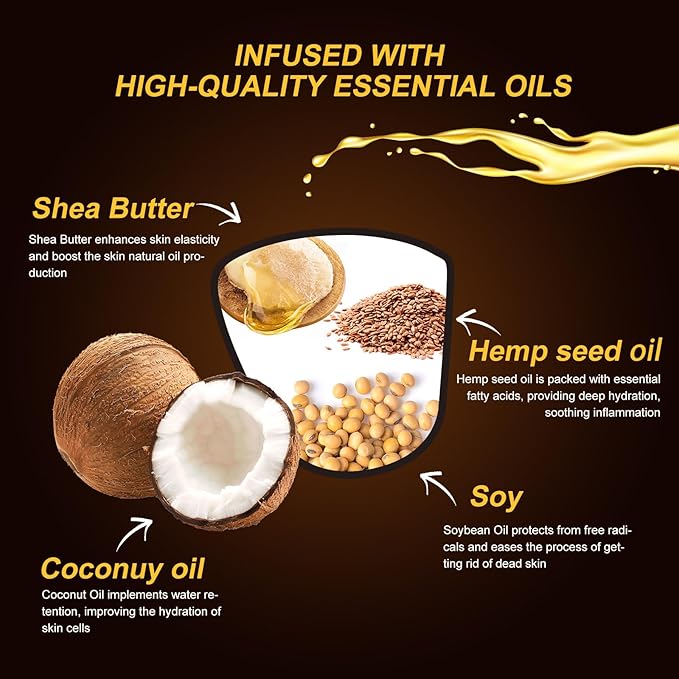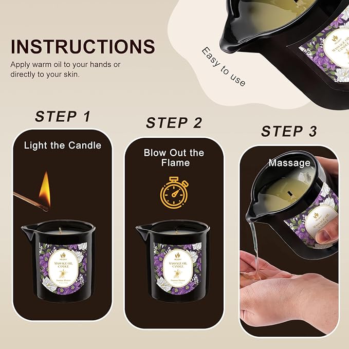 - MASSAGE OIL CANDLE: Elevate Your Home Spa with Our Luxurious Body Oil & Lotion Candle, Ultra-Moisturizing Formula: Keep your skin hydrated, nourished and super soft with this treatment candle. Essential oil absorption after massage is not greasy. Naturally nourishing your skin for a 24 hours long-lasting treatment. Massage deeply to intensively nourish and hydrate the skin.