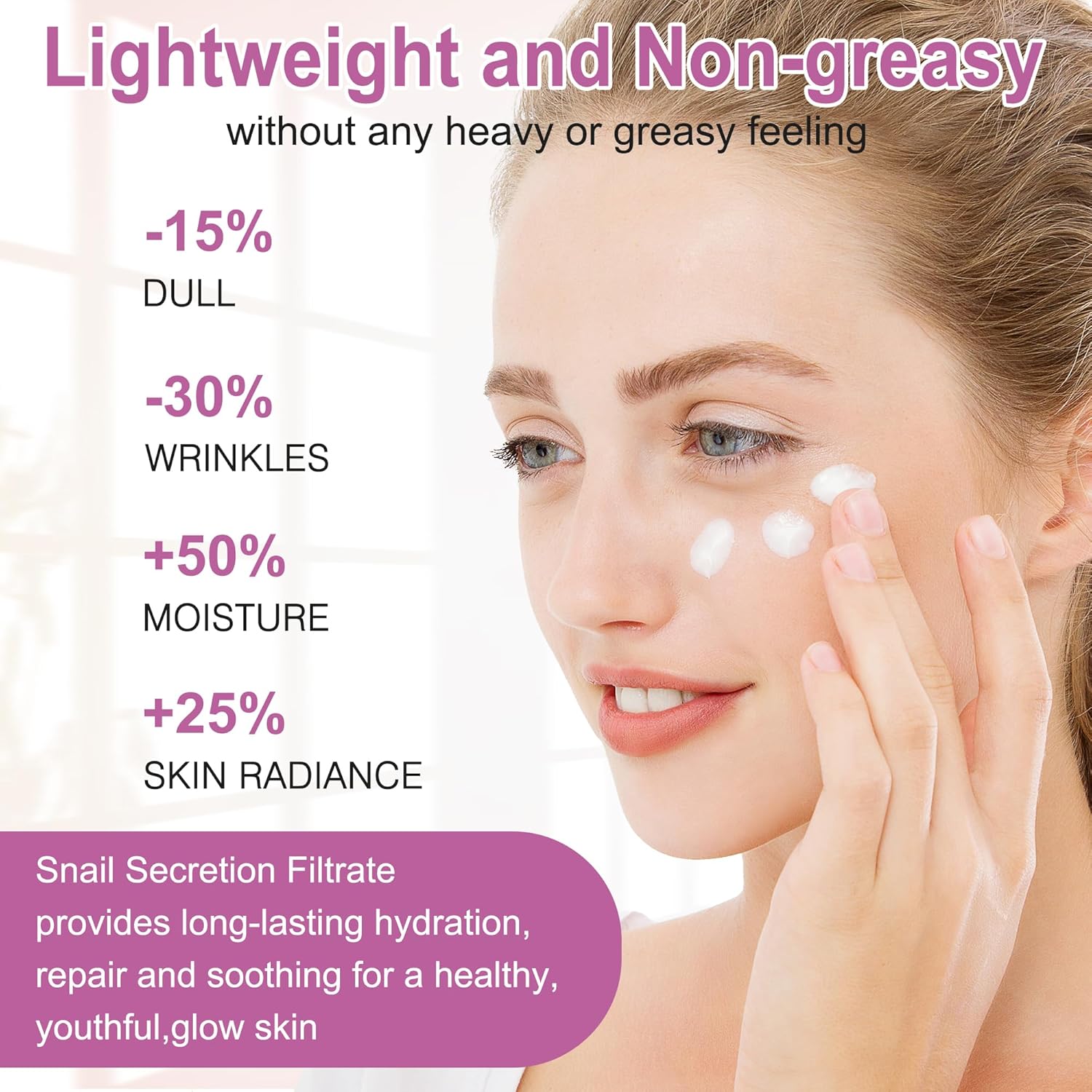 - Lightweight and Non-greasy: Our facial skin care products absorb quickly to get long-lasting hydration,repair and soothing skin.Enjoy a healthy glow without any heavy or greasy feeling.Snail Mucin is obtained in a friendly way.NO Snails are Harmed