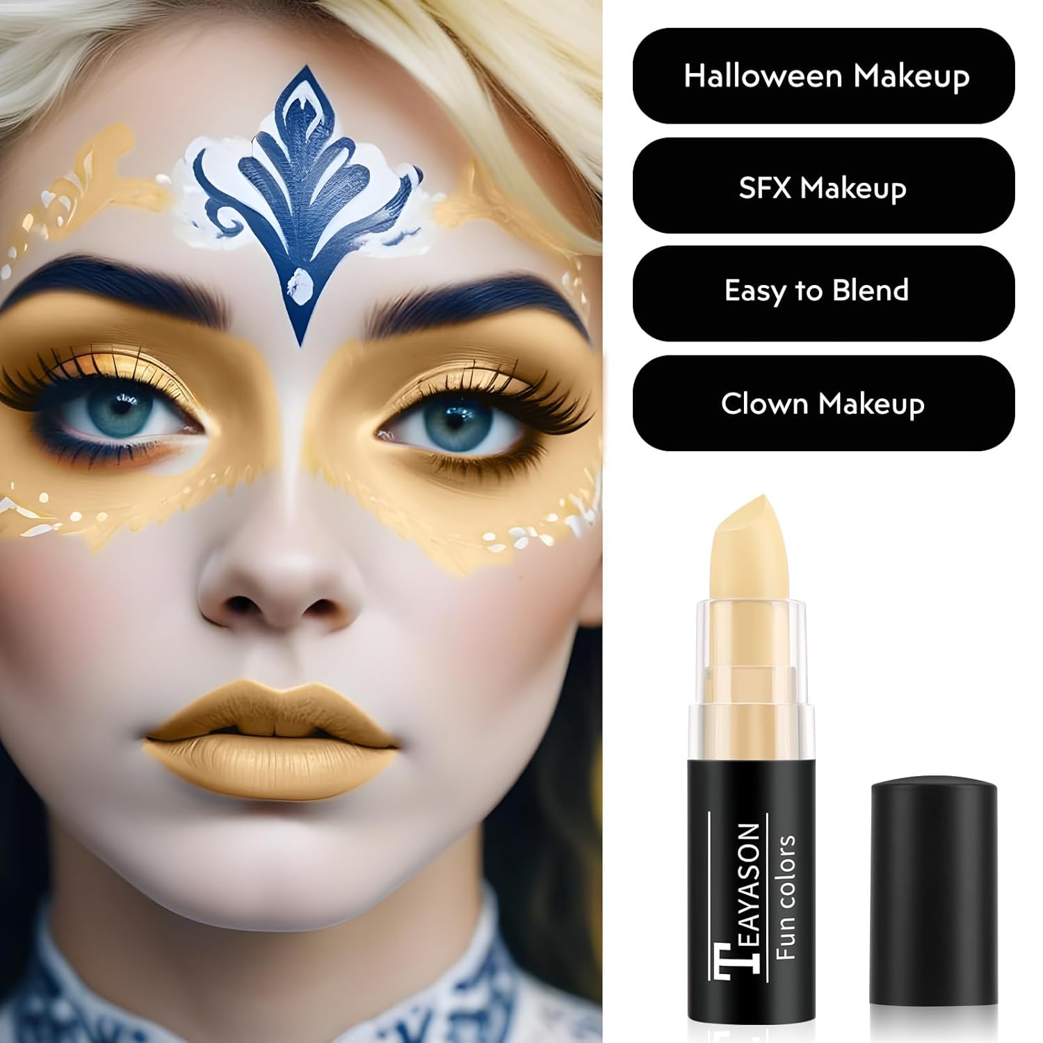 - OCCASIONS & MULTI-USE --- Yellow face body paint stick/ matte yellow lip-stick can be used for face, body, lips makeup. Perfect for Halloween costume makeup, party, carnival, Cosplay, SFX makeup, special effects makeup, Day of the Dead makeup, festival makeup, stage or theater performance; Various Halloween fancy makeup, such as Zombie, White Clown, Vampire, Skeleton, Skull, Catrina, Joker, Witch, Sally Face, Avatar, Cat, Corpse Bride, Goth, Alien, Ursula, Devil, Gothic, Frankenstein, Mime, Werewolf, Camouflage, Monster, Camo, Goblin and other makeup.