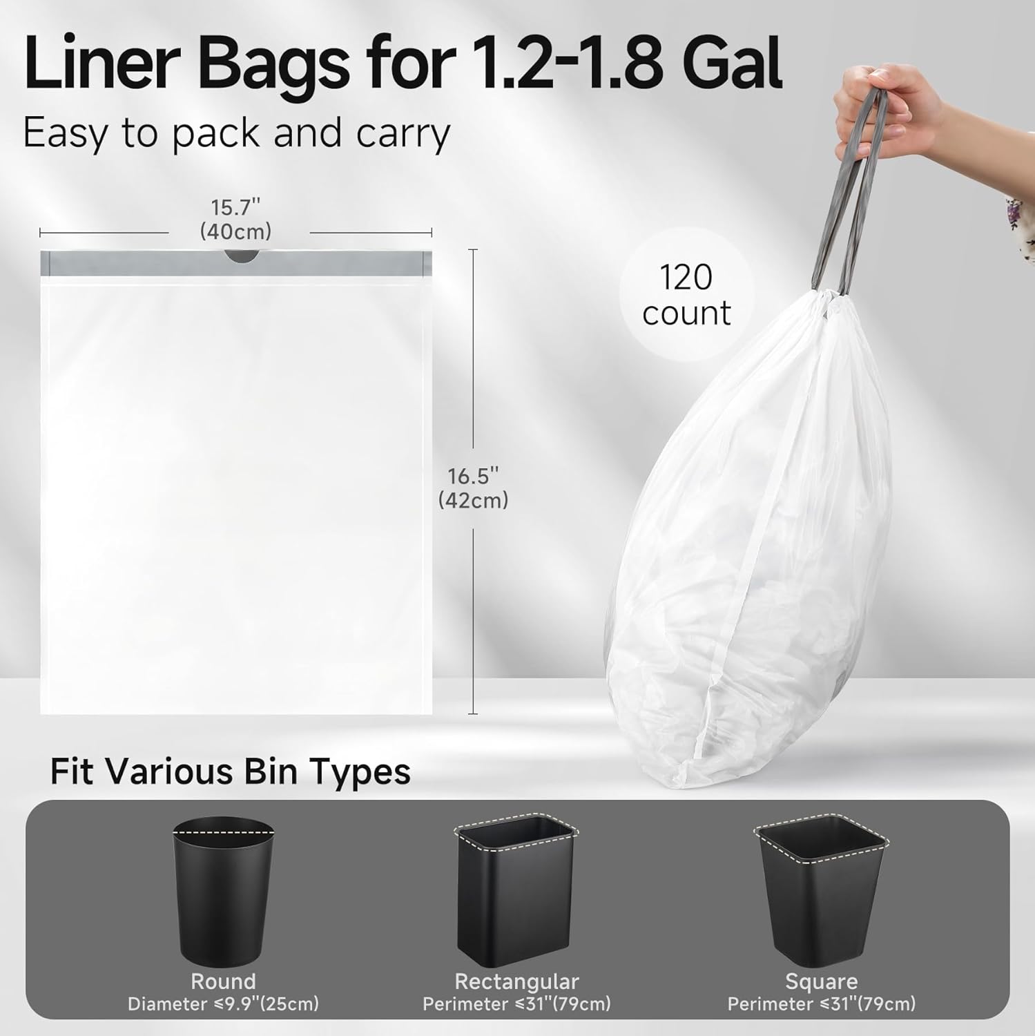 TIPGO Small Trash Bags Drawstring 1.6 Gallon, Pre-Cut Mini Garbage Bags for 1.2-1.8 Gallon Trash Bins, 120 Count (Code A)