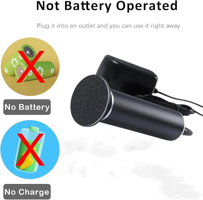 - [NOT BATTERY POWERED]: LVSENLIN electric foot callus remover does not use batteries, so you don't have to worry about low battery.When you want to use it, plug it into an outlet and you can use it immediately.....NOTE: This foot grinder is not cordless and you will need to keep it plugged in when you use it.