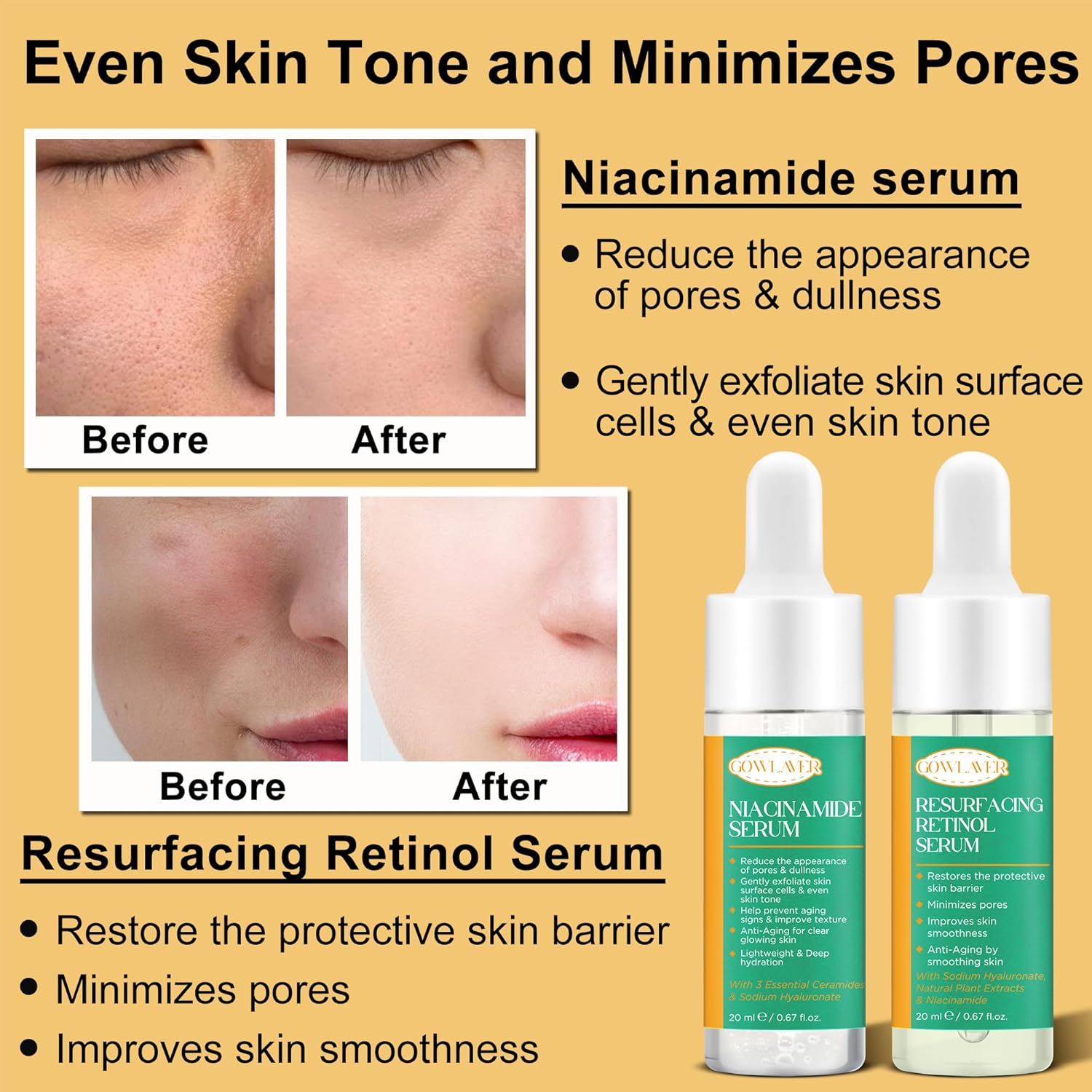 - Even Skin Tone and Resurfacing:This set includes our beloved Niacinamide Serum to even skin tone,Retinol Serum to reduce fine lines and wrinkles, and Hyaluronic Acid Serum for deep hydration. Used together,these potent serums visibly improve skin texture, tone, and firmness for a more youthful complexion