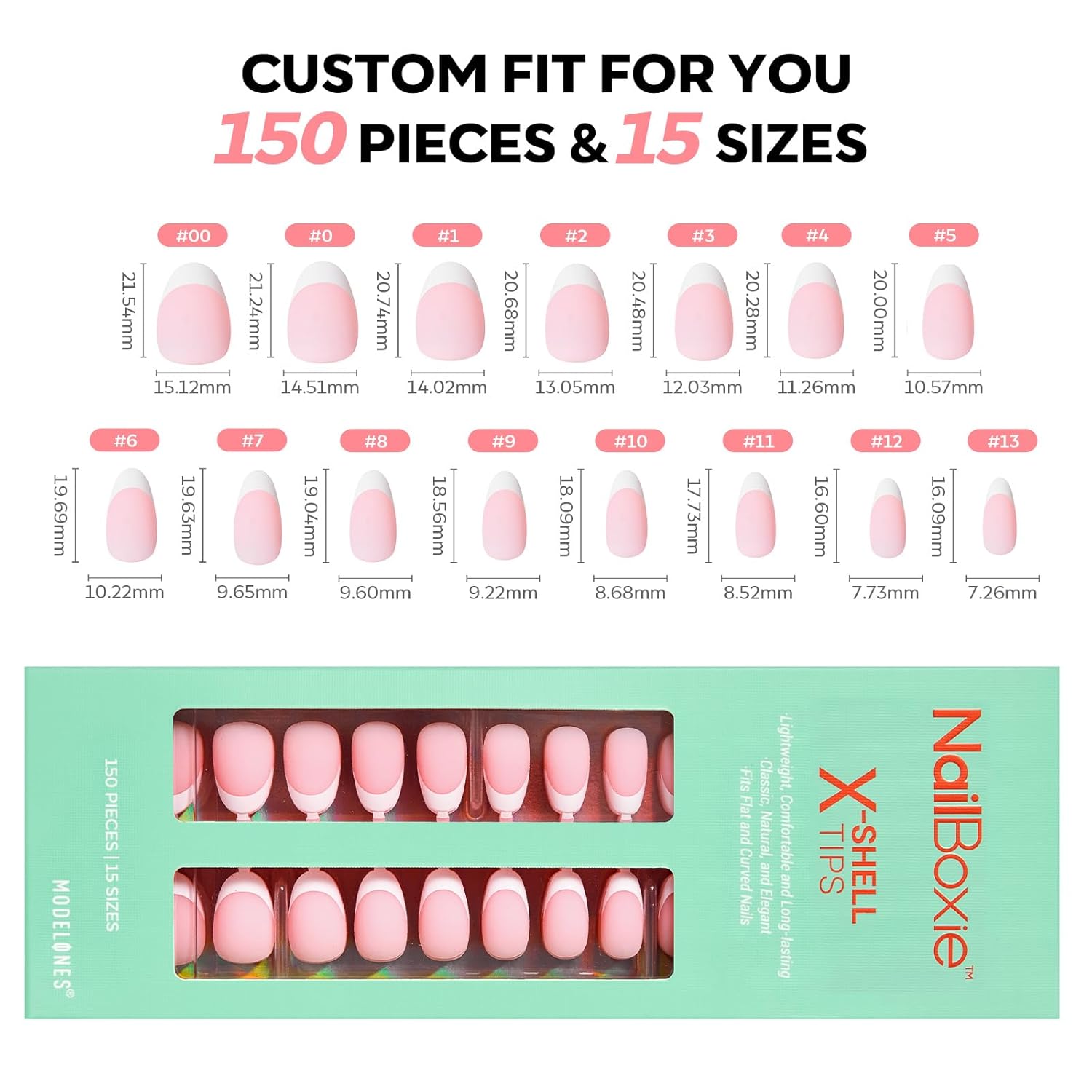 - French Tip Press on Nails Set: Upgraded classic French manicure style kit includes 150 pieces in 15 sizes for a perfect fit on your nail beds. Works beautifully on all nail types, including short and flat nails.