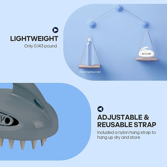 - Our scalp brush massager is only 0.143 pound for portable convenience and carry on the go. We also include an adjustable and reusable hang strap to hang up the scalp massager dry and store in a breeze. All Pass in Prop 65.
