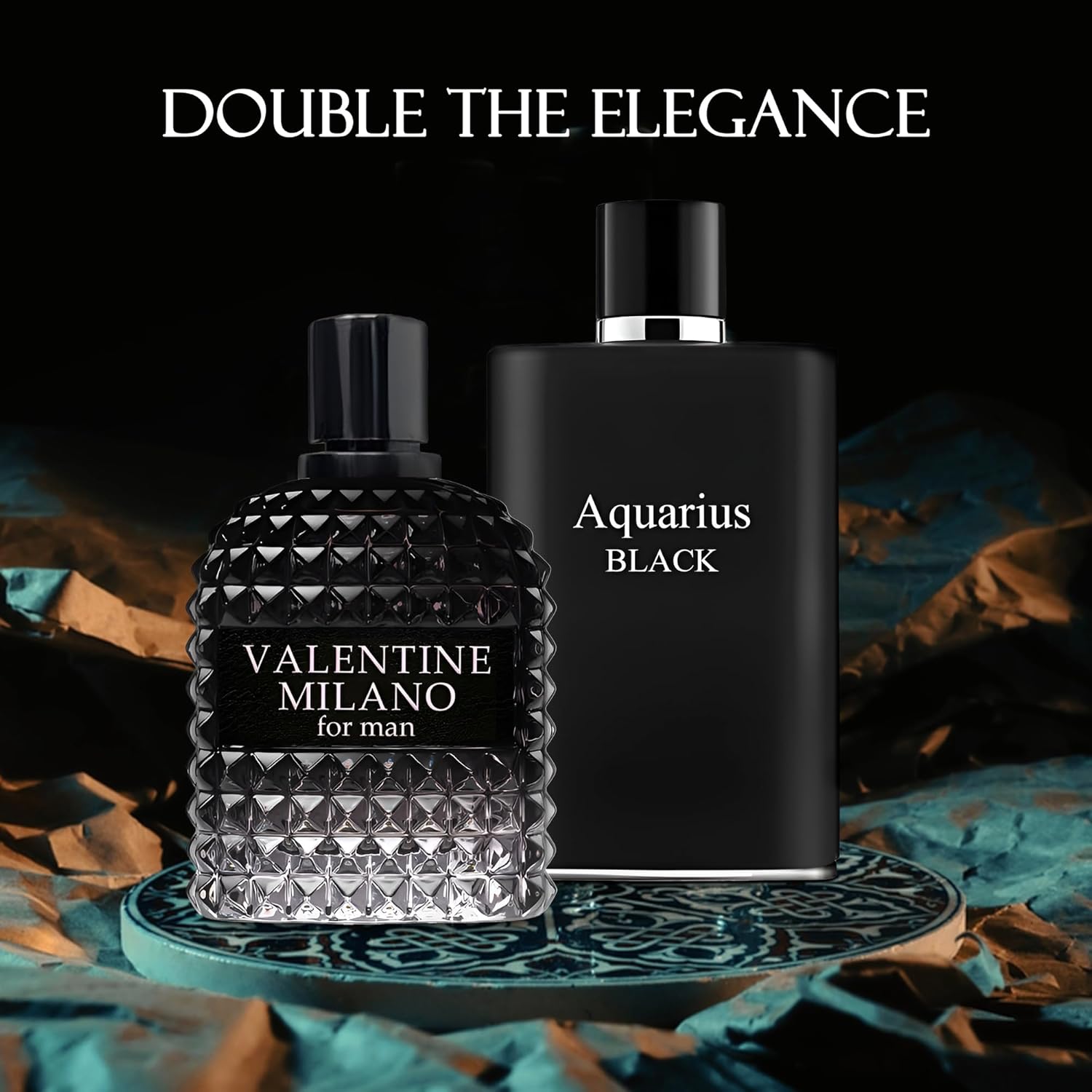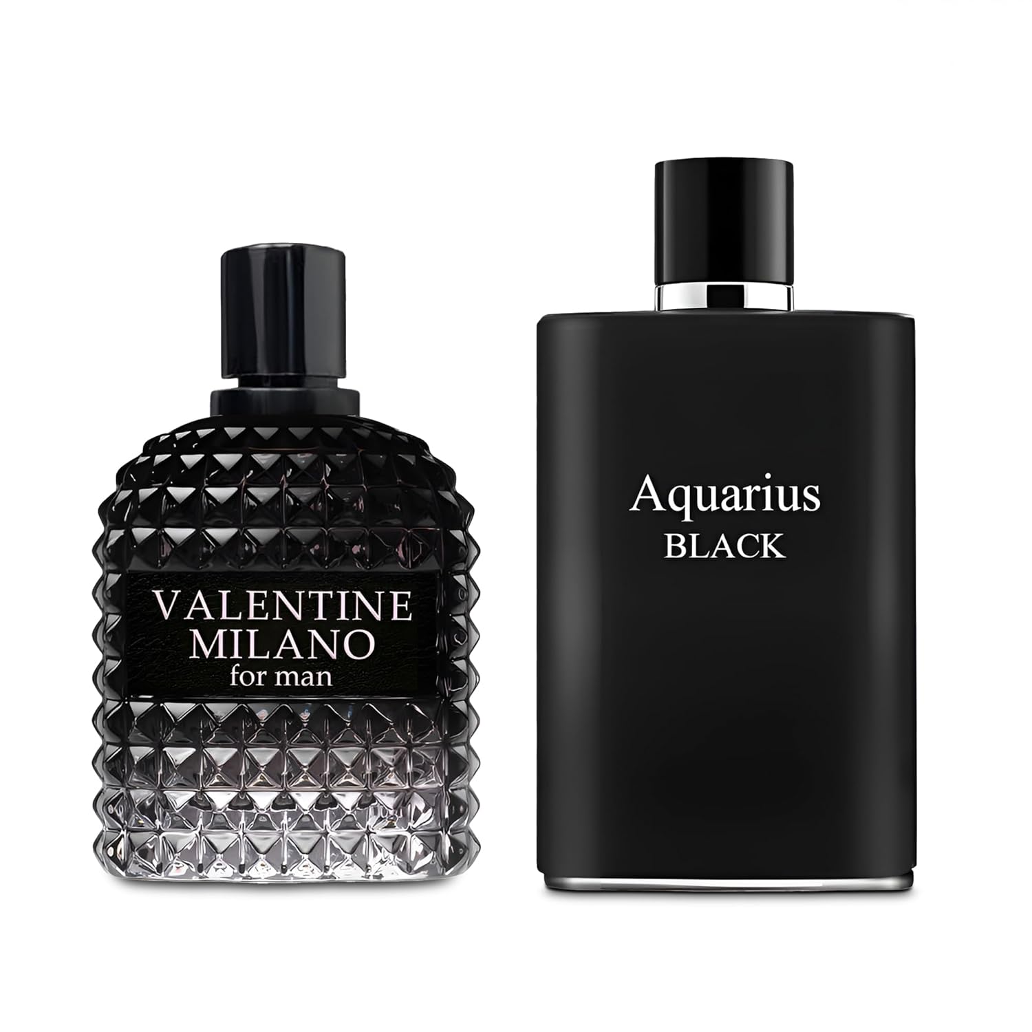 - 2Pack Men's Cologne Set: Crafted for men, Valentine Milano and Aquari Black embodies luxury and sophistication.
