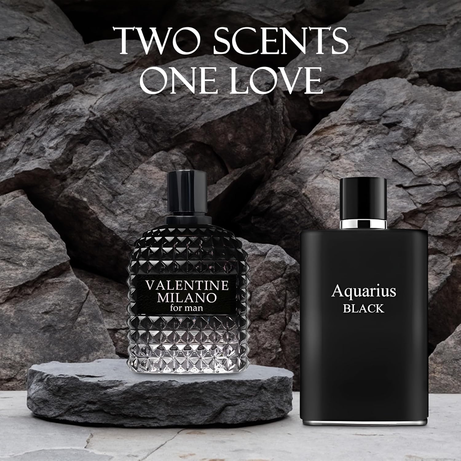 2PCS Valentine Milano/Aquari Black Eau De Toilette for Men-Fresh,Romantic Scent Perfume for Men 3.4 Fl Oz Each Mens Cologne For All Skin Daily Used