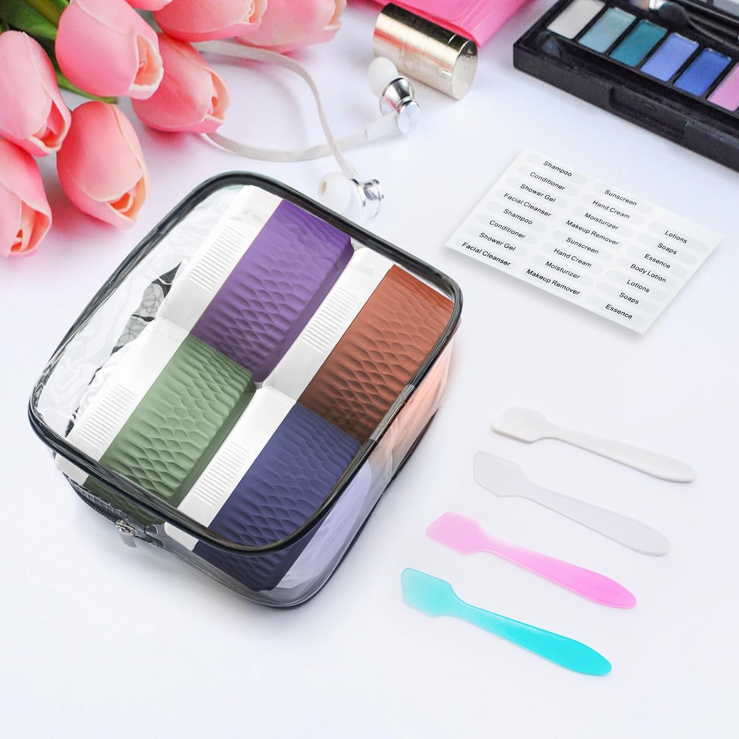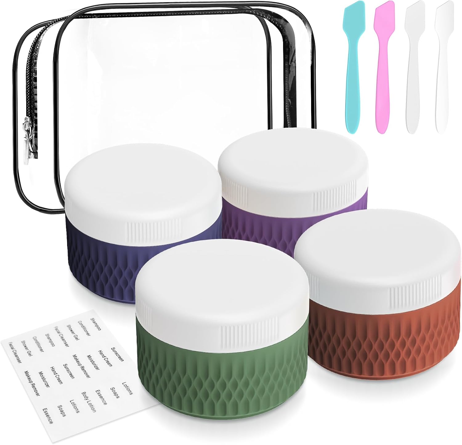 - 【Designed for Travel Accessories】 This toiletries container set includes 1 waterproof bag, 1pcs label sticker,4 travel silicone cream jars, and 4 spatulas! The variety of colors makes it simple to identify the contents of each jar.