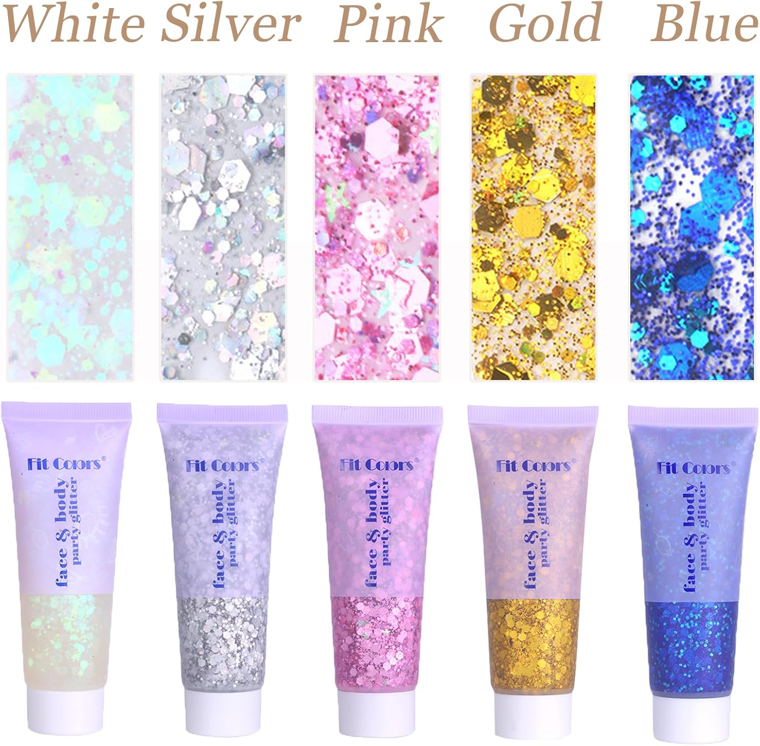 Face Body Glitter, Hair Glitter Sparkles Chunky Face Glitter Gel for Girls Makeup Singer Concerts Mermaid Festival Sequins Face Paint (White+Silver+Pink+Gold+Blue)