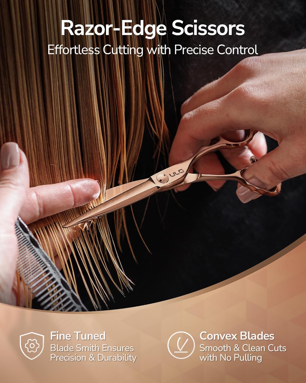ULG Professional Hair Cutting Scissors with Luxury 18K Rose Gold Finish 6.5" Barber Scissors 440C Japanese Stainless Steel Hand-Honed Razor Sharp Blades Offset Handles Tension Adjustable, Right-Handed