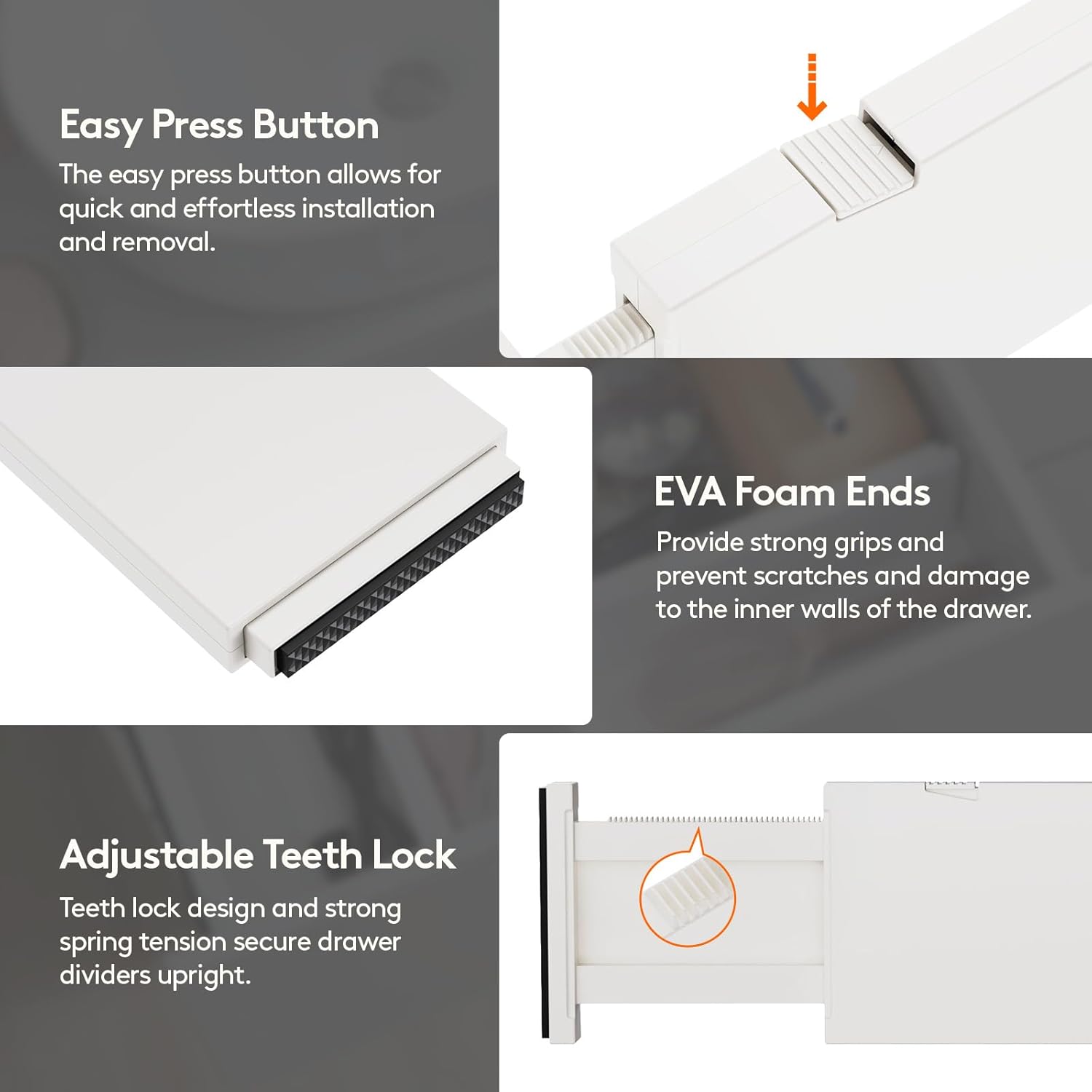 - Premium Material: Our drawer organizers for clothing are crafted from sturdy ABS material with high-quality EVA foam sponges on the ends; These sponges prevent scratches and damage to the inner walls of the drawer, leaving no trace or residue behind
