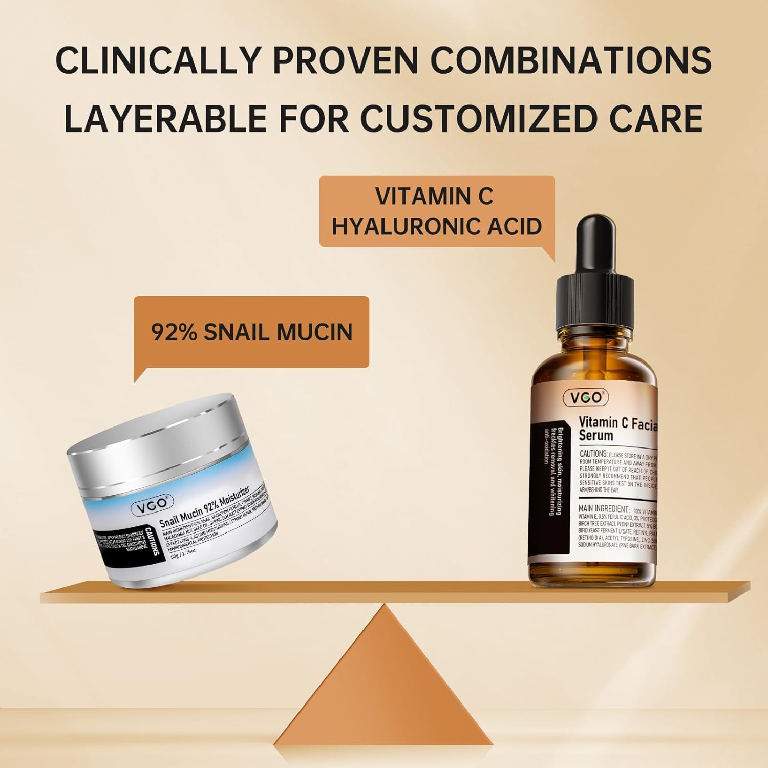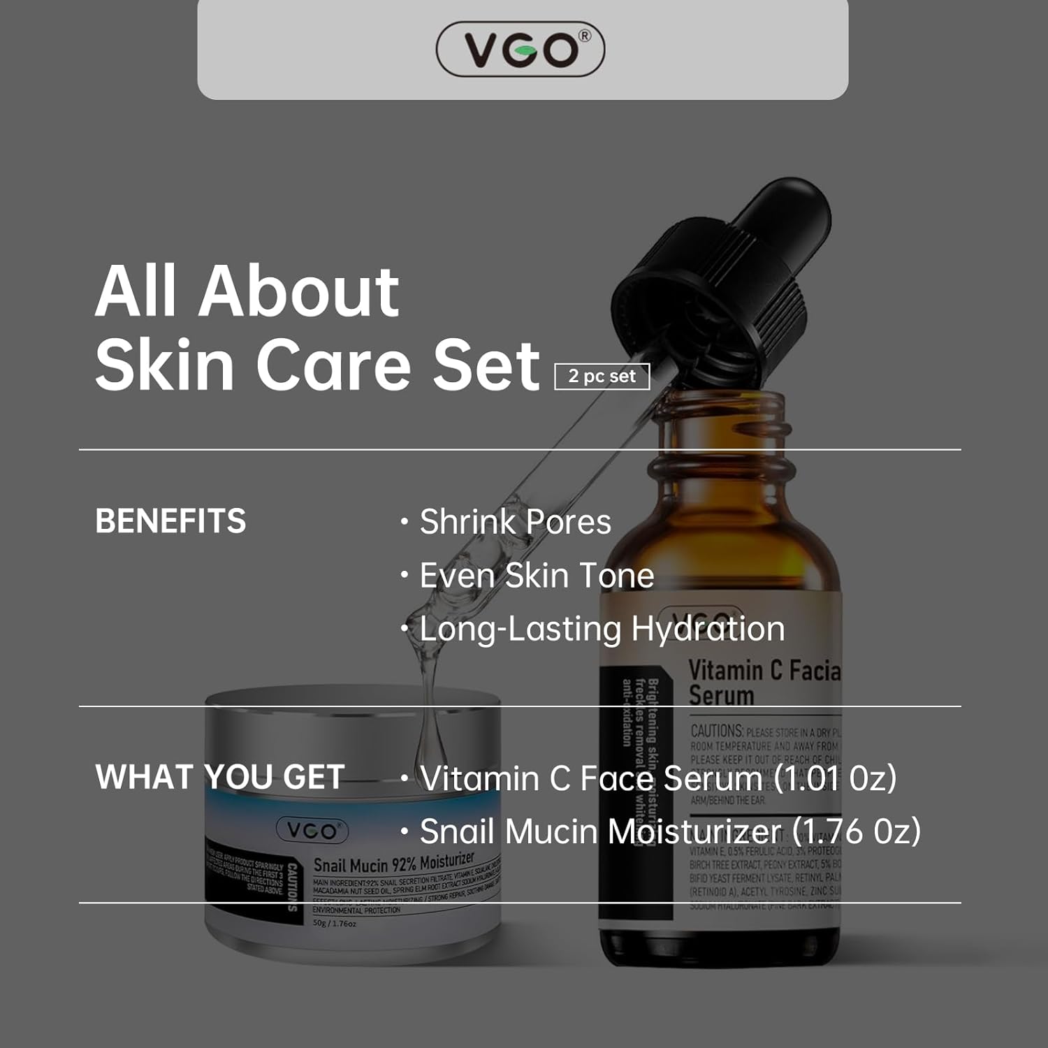 VGO Skin Care Set, with Snail Mucin 92% Moisturizer 1.76 Oz & Vitamin C Face Serum 1.01 Oz, Daily Hydrating & Firming Skincare Routine Kit for All Skin Type