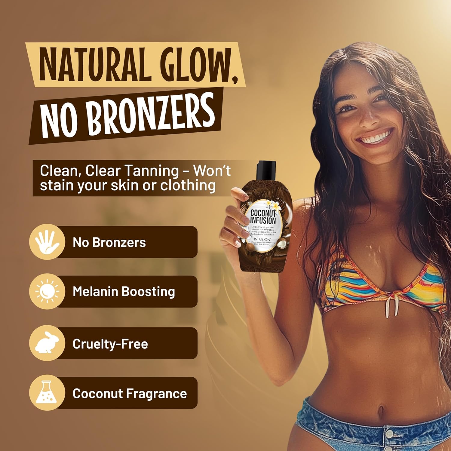 - Tanning: Infused with quad accelerators, Coconut Infusion lotion helps with deeper tan in the sun or on tanning beds.