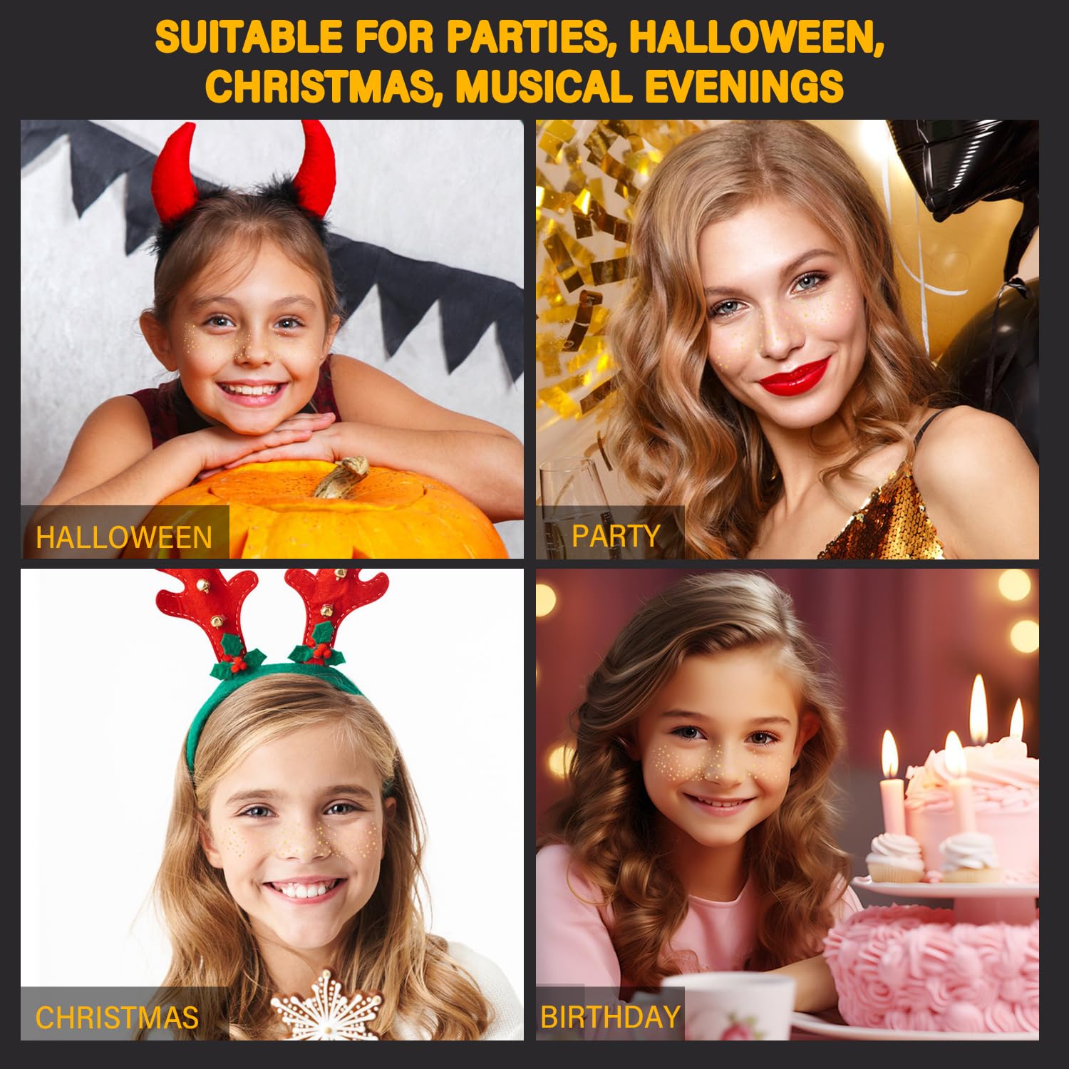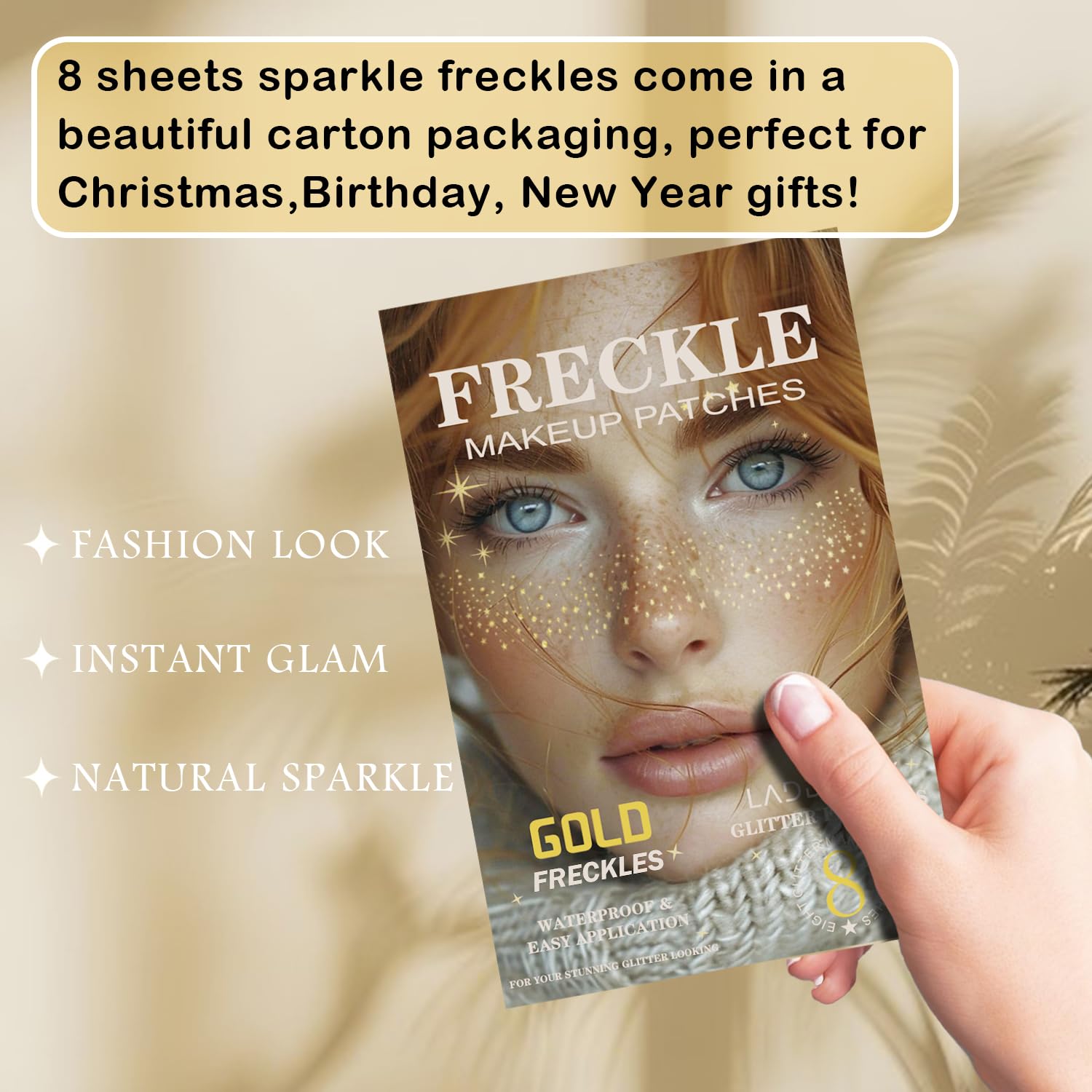 - Sparkle Gold Glitter Freckles: These 8 gold glitter patches allow you to create a stunning, glittery look on your face for special occasions or festivals. Perfect for wearing in Halloween, Christmas, birthday parties, concerts, dances and shows!