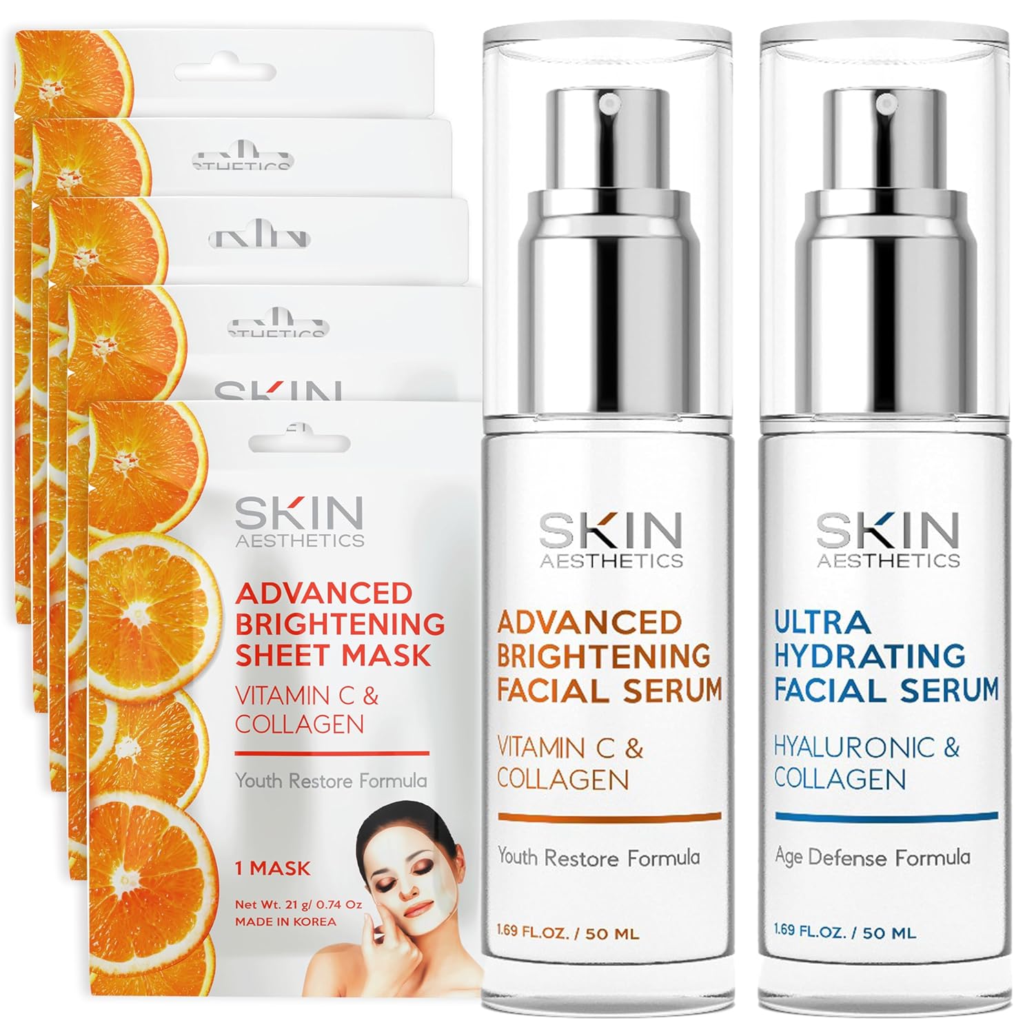 Serum & Face Mask Set, Vitamin C & Collagen & Hyaluronic Acid Value Set - Anti-Aging, Hydrating - Clean Beauty Ingredients, Cruelty-Free Korean Skin Care - Set of 3
