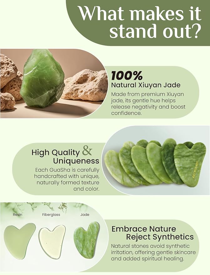 - Sourced from Nature:Rena Chris Gua Sha Facial Tool is handcrafted from 100% natural Xiuyan Jade; Xiuyan jade symbolizes warmth and softness