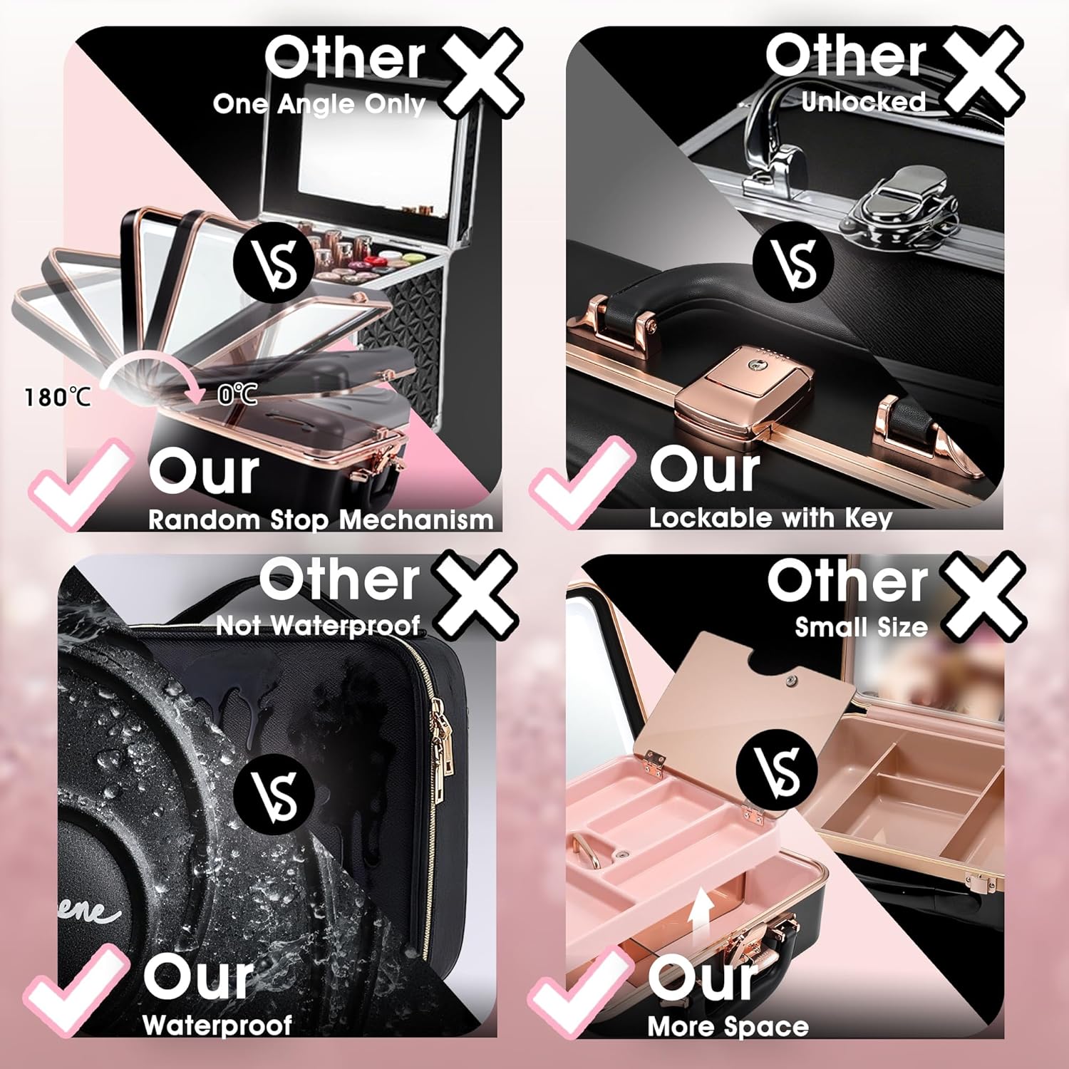 - 【New Upgrade Portable Train Case】- This cosmetic case offers organized, portable beauty storage. Features include a magnetic, movable top tray and adjustable base dividers for flexible arrangement. A built-in 4K silver-plated mirror creates a travel-friendly vanity. At 12" x 8.9" x 4.5", it's compact and lightweight, ideal for travel.