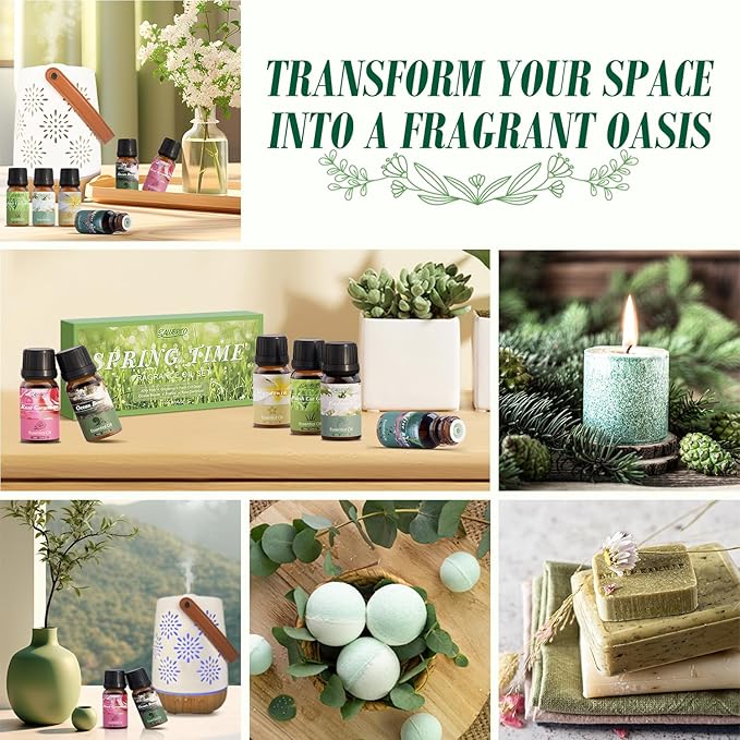 - Indulge In The Spring: Experience the refreshing aromas of fresh cut grass, after rain, ocean breeze, gardenia, freesia and rose geranium in our spring essential oils set. Capture the essence of the season and bring the sweet scent of spring into your home.