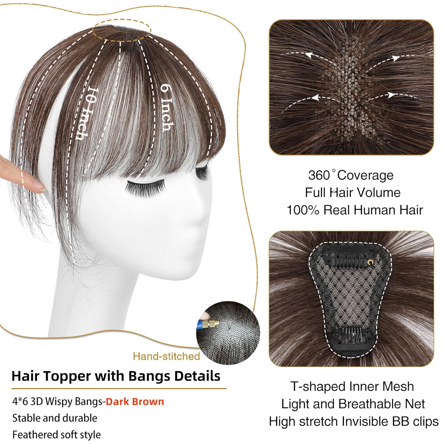 MORICA Bangs Hair Clip, 360° 3D Cover Clip in Bangs 100% Real Human Hair Toppers with Bangs,Hair pieces for Women Fake Bangs for Daily Wear (Dark Brown, 4×6 3D Bangs)