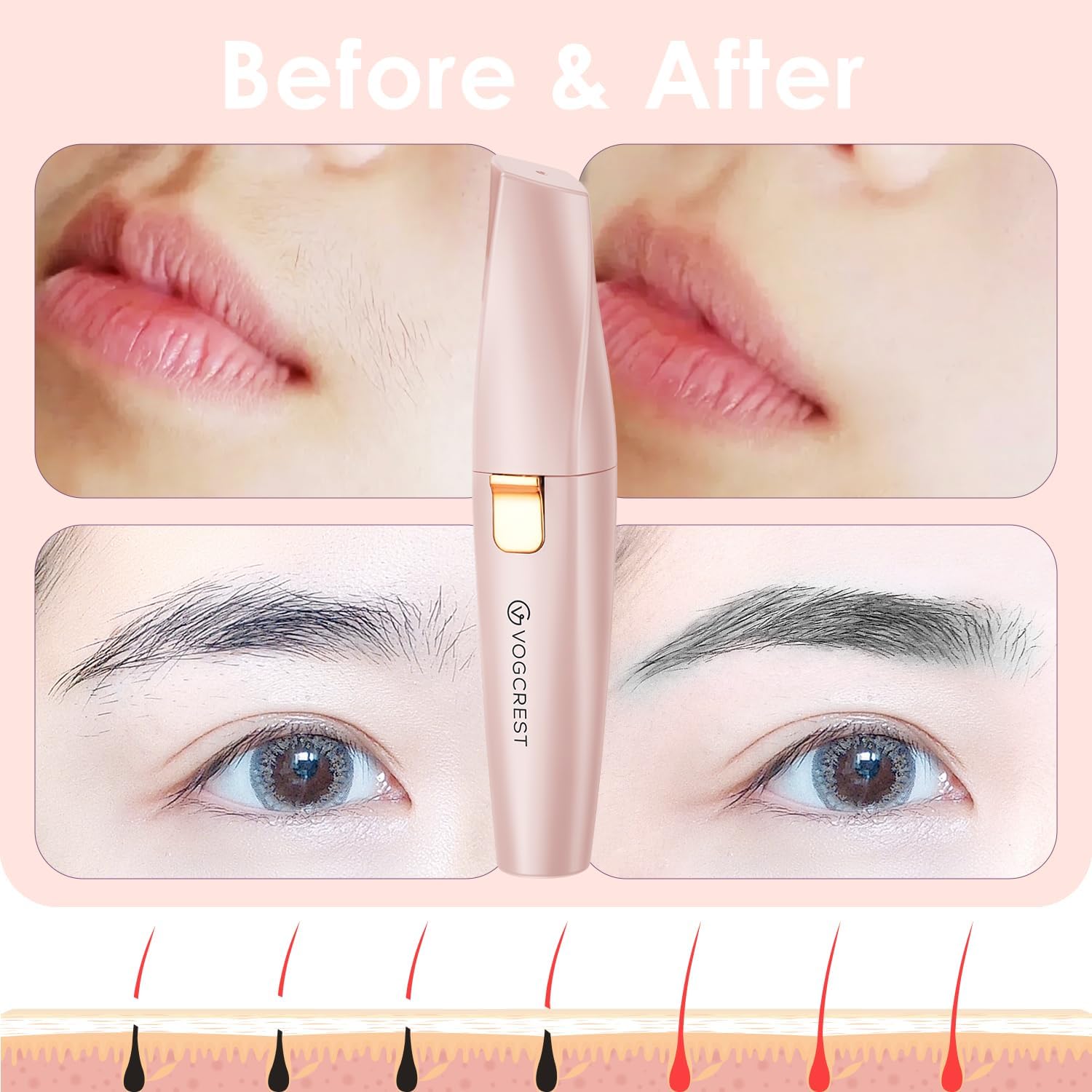 VG VOGCREST Eyebrow Facial Trimmer: 2 in1 Rechargeable Facial Hair Removal and Eyebrow Shaver - Face Lips Body Painless Facial Razor with Built-in LED Light (Pink)