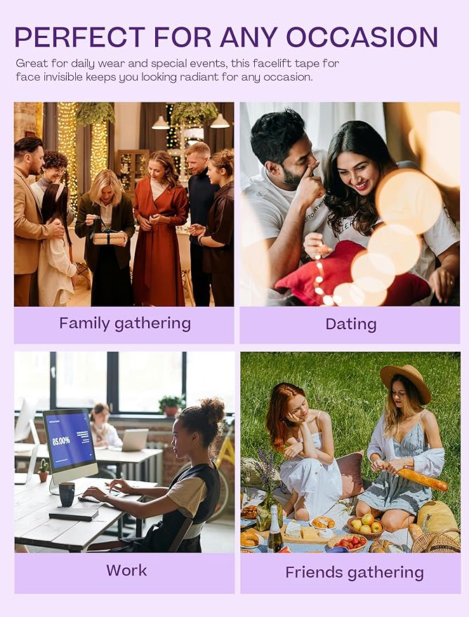 - SKIN-FRIENDLY & BREATHABLE: Our facial tape face lift invisible is crafted from gentle, skin-safe materials. Breathable and non-irritating, it provides a comfortable lifting effect, suitable for all skin types and daily wear.