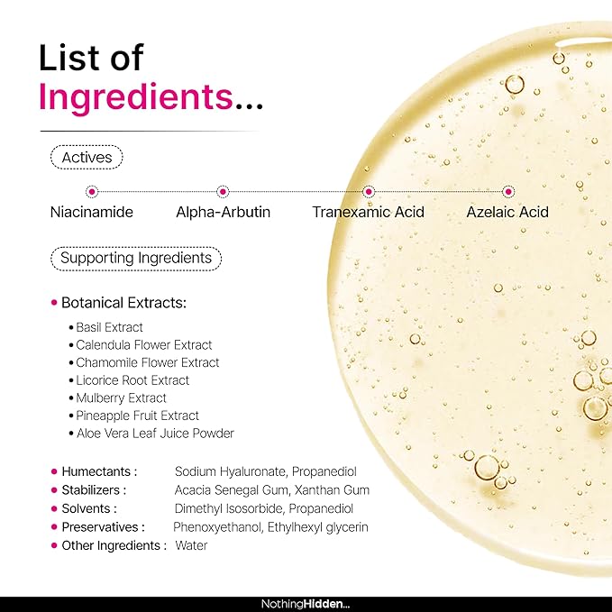 - CLARIFYING & EVEN SKIN TONE: Azelaic Acid helps with clogged pores, uneven texture, and inflammation, making it useful for acne-prone skin. Tranexamic Acid addresses dark spots, redness, and uneven skin tone by regulating melanin production. Alpha Arbutin reduces hyperpigmentation and helps lighten dark spots for a more even complexion.