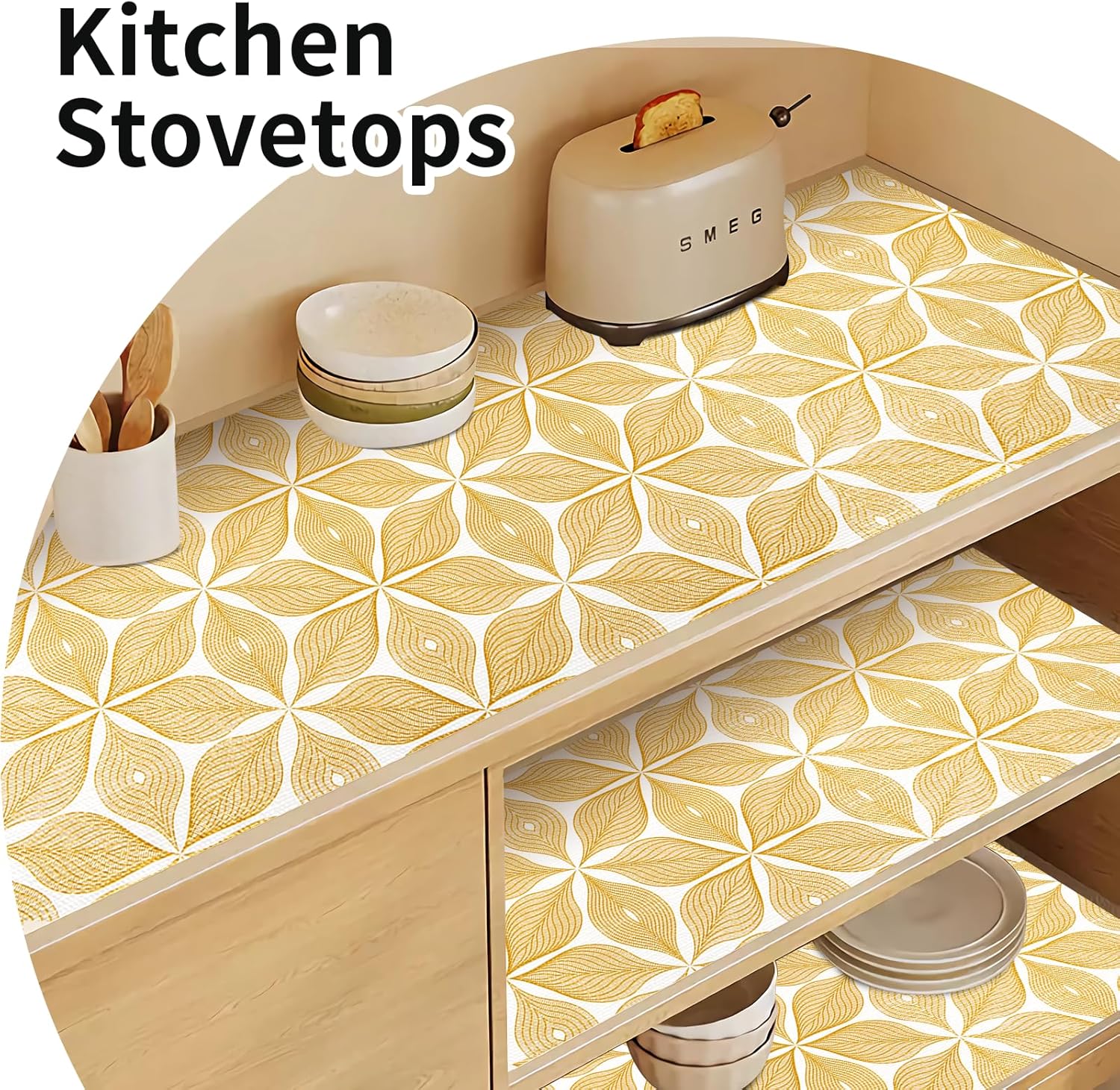 Shelf Liners for Kitchen Cabinets 12in x 20FT, Non Adhesive Cabinet Liner Strong Non-Slip Golden Leaf Drawer Liner, Easy to Clean for Shelf, Cabinet with Knife and Tape Measure