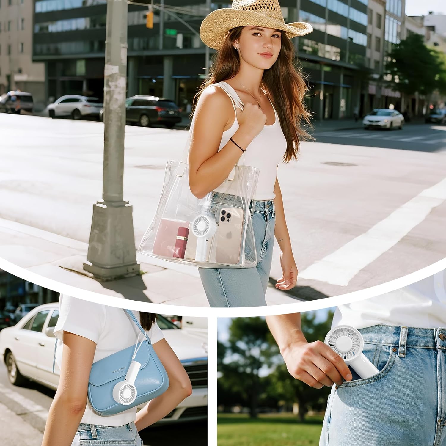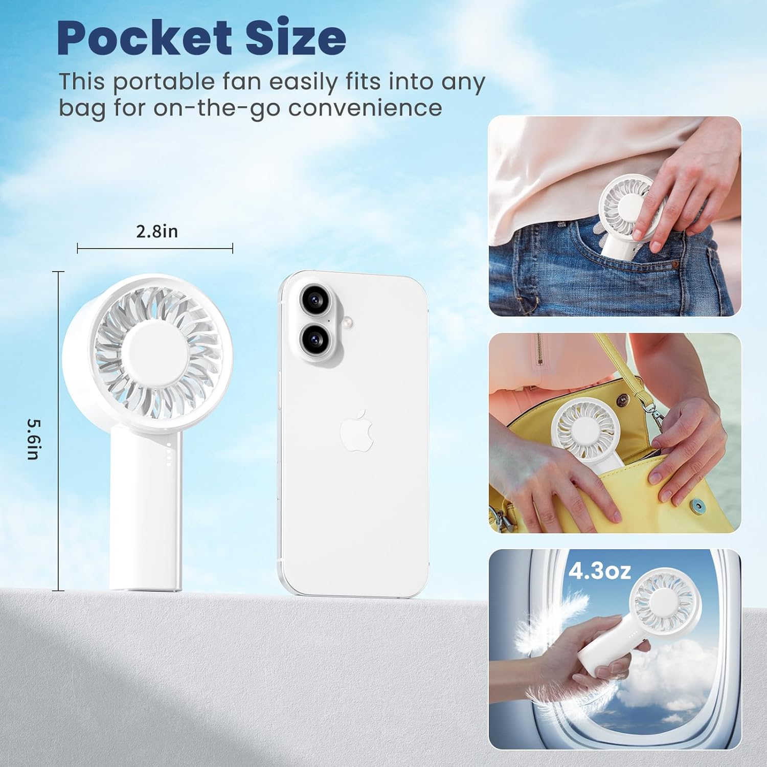 - Pocket-Sized Design: 5.6in*2.8in mini size, its size makes it easy to put in your pocket/bag/purse or store away without issue. Use it for concerts, trave, or commuting. This portable mini fan allows you to use it whenever you want