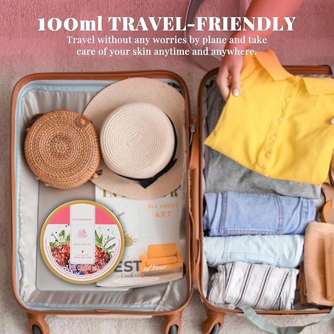 - TRAVEL-FRIENDLY: This Strawberry Body Lotion is designed for travel convenience. It has a capacity of 100ml and is small and exquisite, making it easy to carry in a bag or suitcase. You can travel without the burden of flying and take care of your skin at any time. It is a considerate travel companion.
