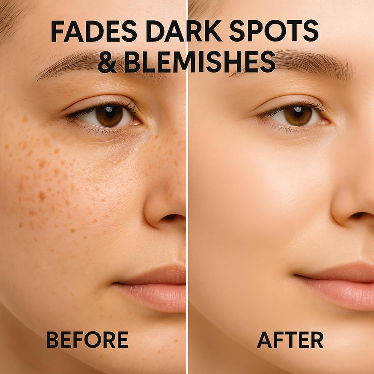 - Dark Spot Correction: Reduces appearance of dark spots,hyperpigmentation, and acne scars - 2. Rejuvenating: Brightens and evens out skin tone for radiant glow - 3. Anti-Aging: Reduces fine lines, wrinkles and skin discoloration - 4. Hydrating: Moisturizes and nourishes skin for soft and supple texture.
