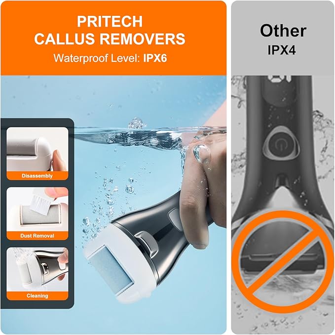 - 【Whole Body Waterproof】The foot callus remover has a waterproof design, the whole body can be rinsed under running water. You can use it to make perfect foot care for your feet when you get out of the shower. It is recommended to dry your feet before use, and then use it for better results. Note: We recommend avoiding frequent submersion to prevent any potential issues