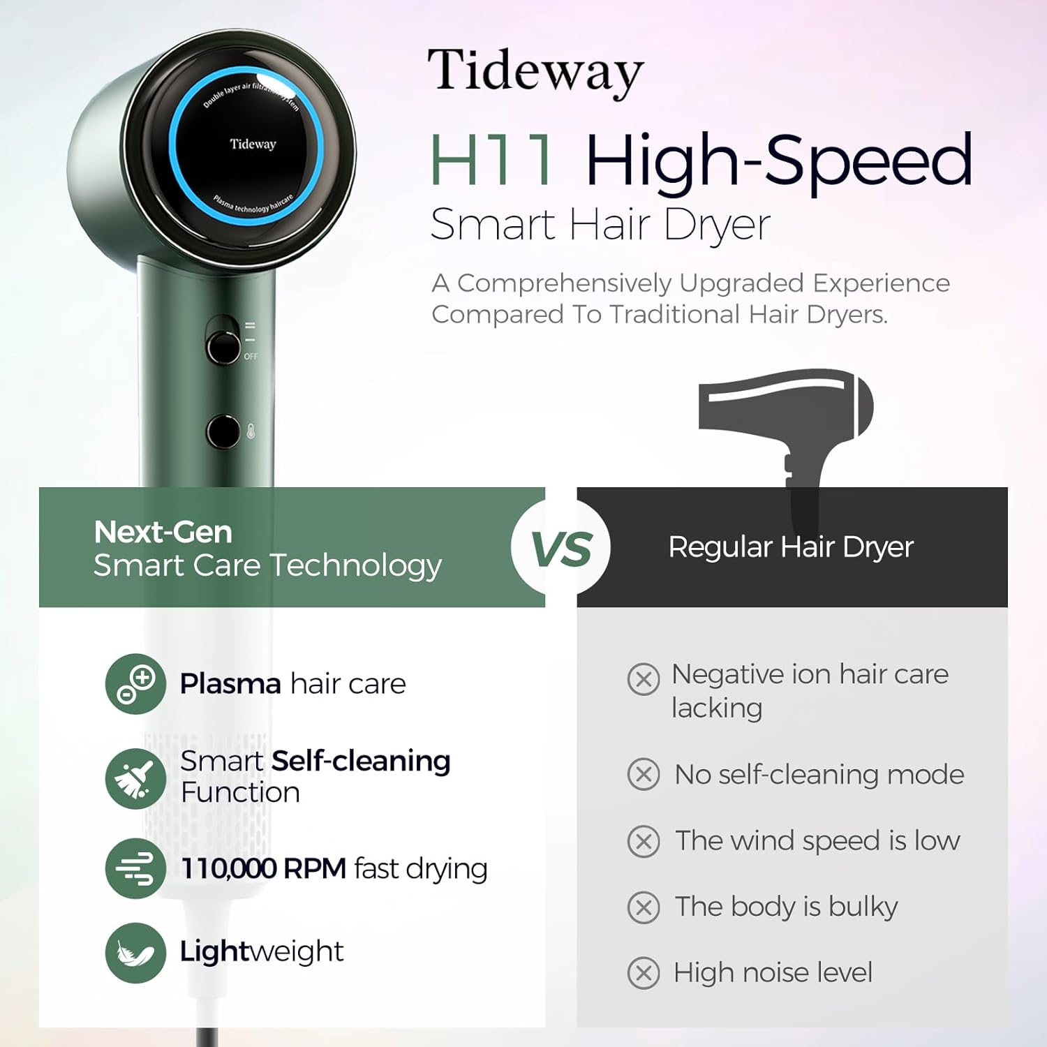 Tideway Hair Dryer, Blow Dryer with Diffuser High-Speed Plasma Ionic Low Noise for Fast Drying, Travel Hair Dryer for Women and Man, Curly/Wavy & Long/Thick Color-Treated Hair H11