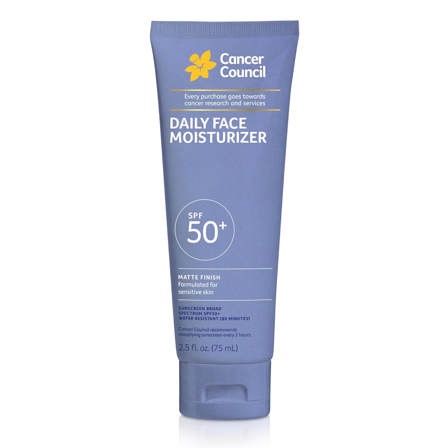 Cancer Council Daily Moisturizer Sunscreen for Face, SPF50+, Sun Care with Green Tea Extract Broad Spectrum UVA/UVB Sun Protection, Sensitive Skin, Paraben & Fragrance Free, Water Resistant, 2.5fl. Oz