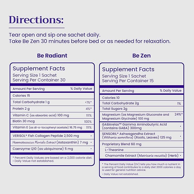 - Beauty & Mood Boosting Duo: Feel relaxed and get ready to shine with BeMe’s Be Radiant and Be Zen bundle. The tear-and-go liquid supplements are filled with science-backed ingredients to eliminate the need for your body to dissolve pills, tablets, or powders for rapid absorption. Includes two boxes: 30-pack Be Radiant and 15-pack Be Zen.