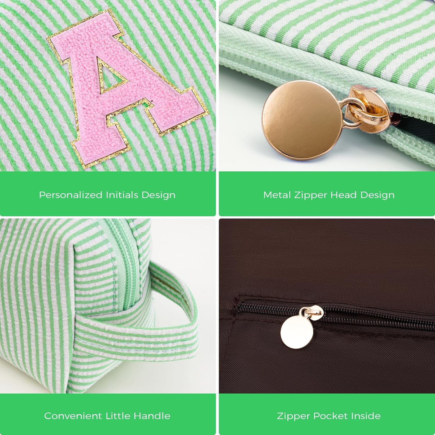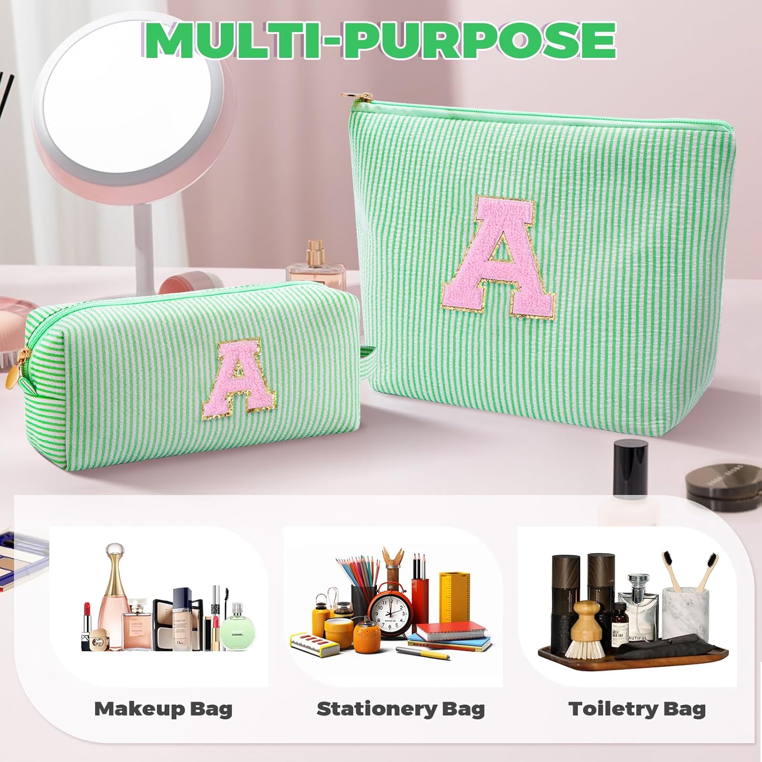 Makeup Bag Set Initials Cosmetic Bag,Gifts for 10 11 12 13 14 15 16 17 18 Years Old Girl Girlfriend Teen Girls Gift Trendy Stuff Personalized Toiletry Bag Travel - Green,A