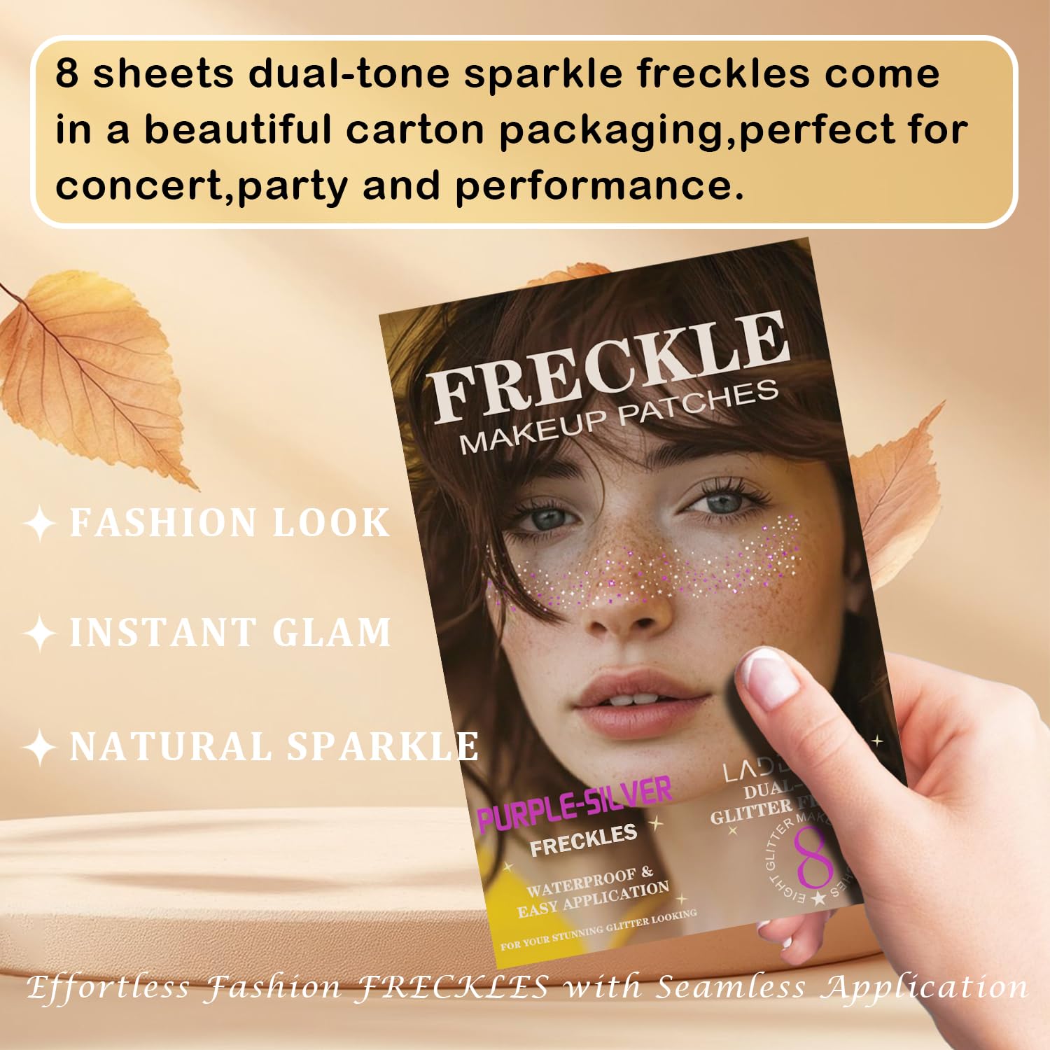 - DIY Fashion Sparkle Freckles: This package includes 8 pieces purple and silver dual-tone glitter freckles.You can easily create a instant glam fashion look.