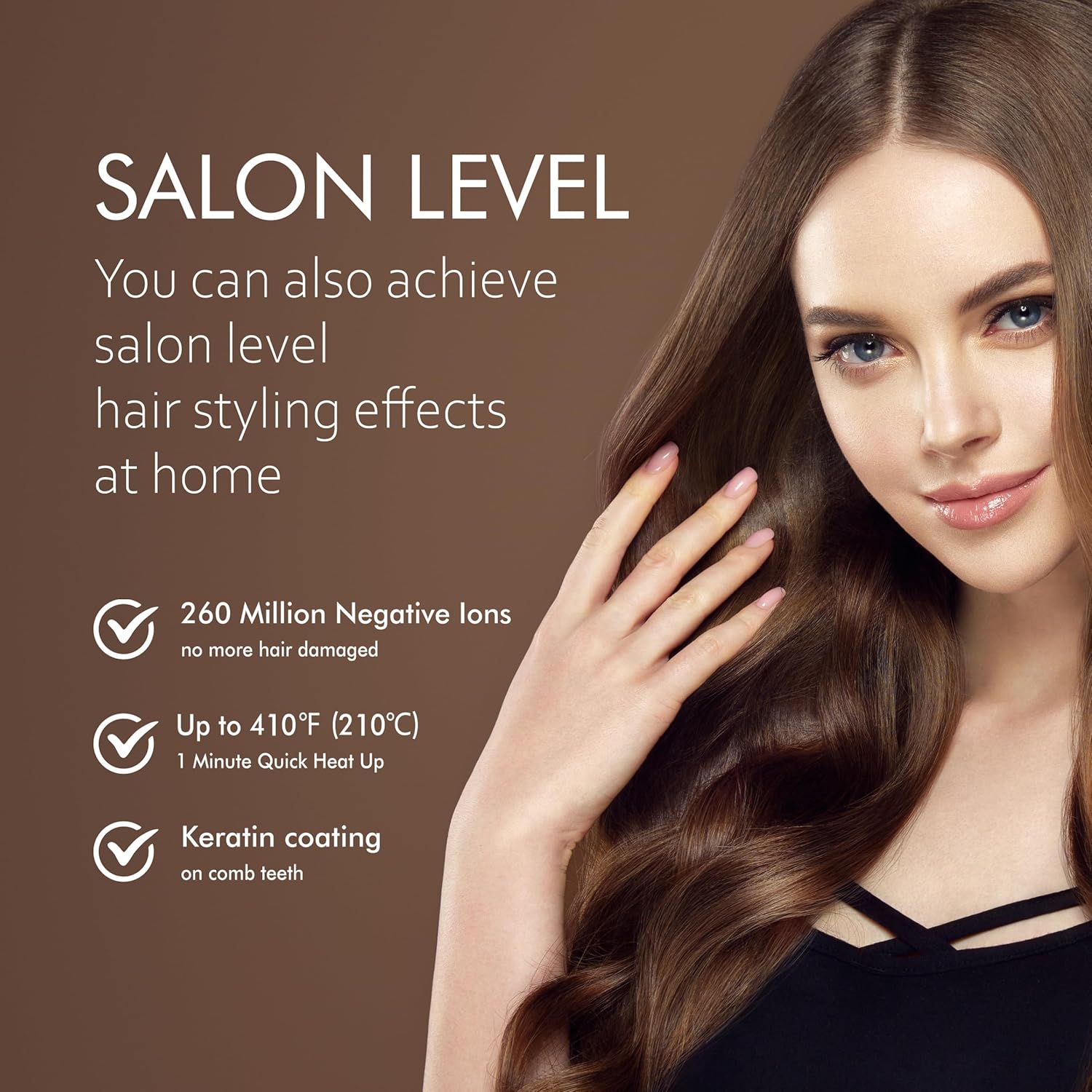 - ๐ 260 MILLION NEGATIVE ION HAIR STRAIGHTENER & KERATIN COATING - Lock moisture and reduce frizz: This travel cordless straight hair comb emits 260 million negative ions while heating, effectively neutralizing static electricity in the hair. Using keratin coating on comb teeth, helps retain hair moisture, resulting in softer, silkier, and shinier hair.