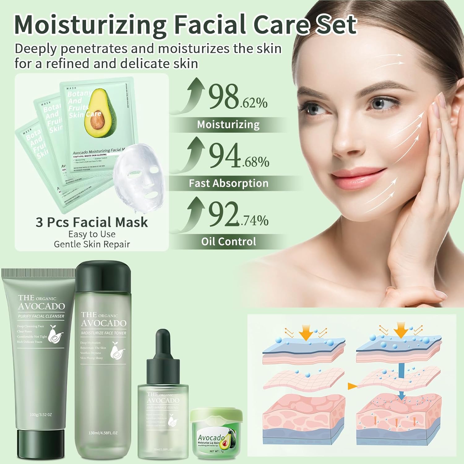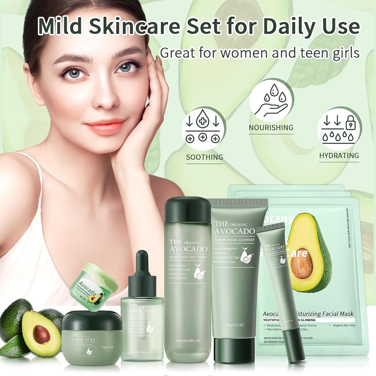 - 9 Pcs Avocado Skincare Sets & Kits: The skincare set with facial cleanser, toner, serum, face cream, eye cream, lip balm, 3 pcs mask to improve skin texture, gently repair dry and damaged skin, and provide moisture for skin