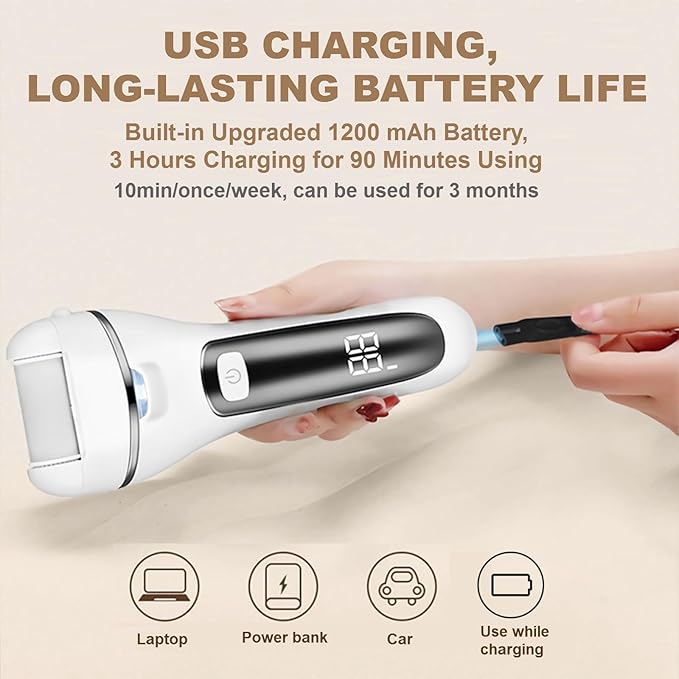 - 【LED Power Display & Rechargeable Long Lasting】The foot scrubber has high quality 1200mah large capacity lithium battery has overcharge protection and battery display function,you can see how much battery left and when to charge.The USB charging time for 3 hours,it can powerfully run continuously for about 90 minutes. Note: Please use the charging voltage: 5V /1A to avoid excessive voltage affecting the service life