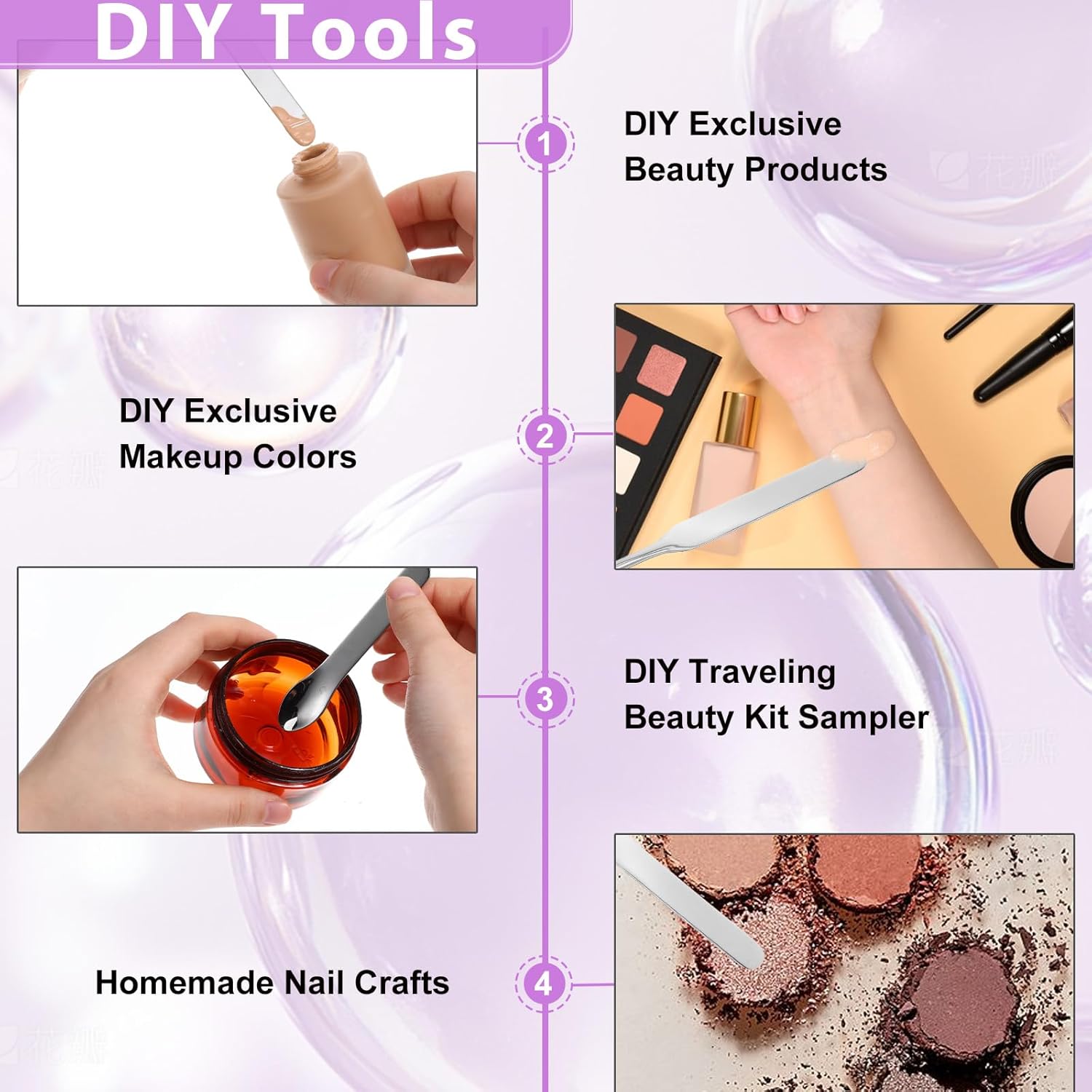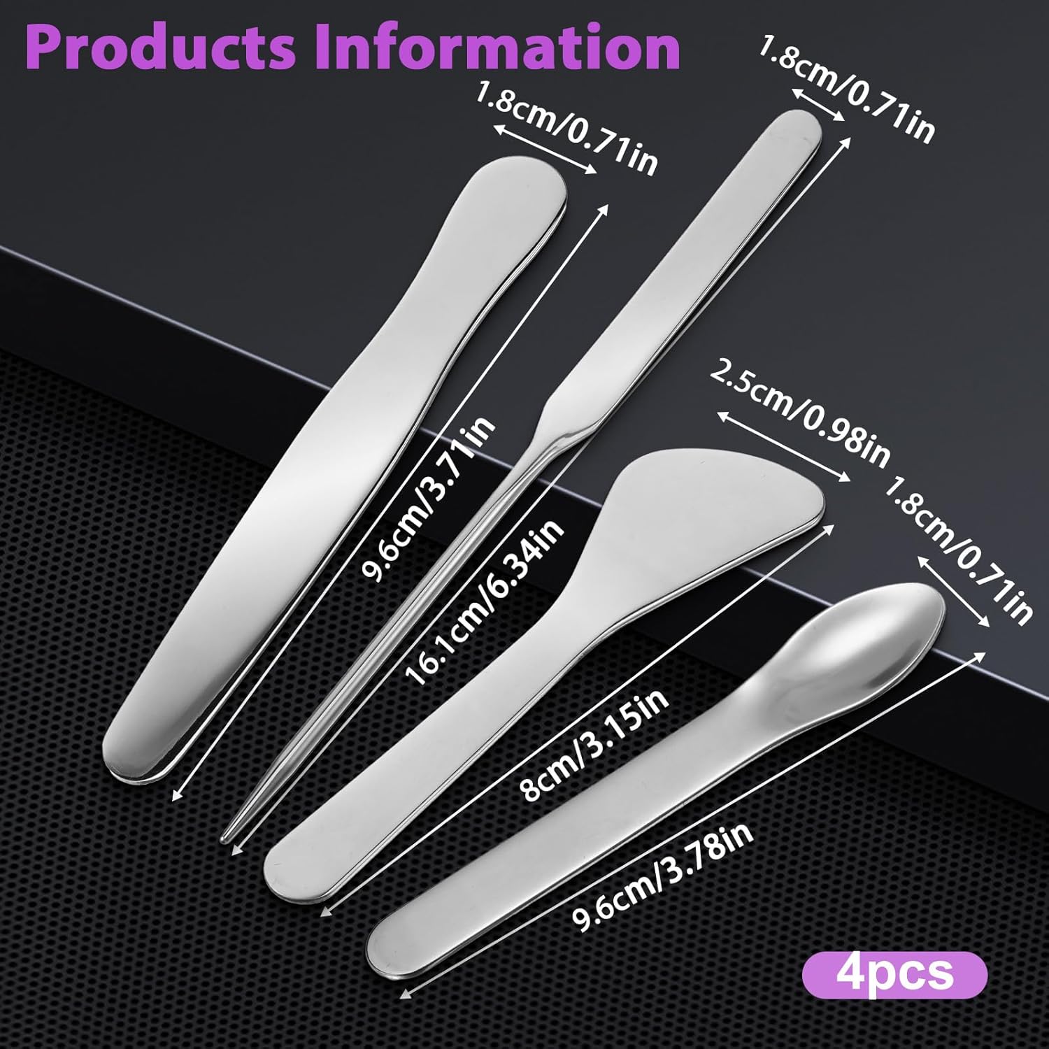 - MAKEUP SPATULA SET: This set carefully selects four mini stainless steel skin care spatulas. The silver appearance is not only fashionable and generous, but also easy to match with various makeup tools