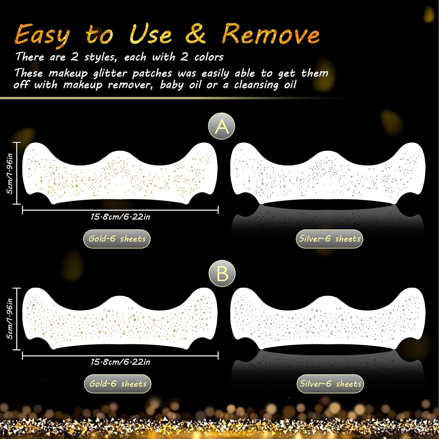 - 【Sparkling Gold and Silver Glitter Freckles】: 24 Sheets in total; Type A Gold-6 sheets, Type A Silver-6 sheets.Type B Gold-6 sheets, Type B Silver-6 sheets. These glitter makeup patches are gentle for all skin types. Make your makeup shine brighter. More quantity to avoid duplicate purchases.