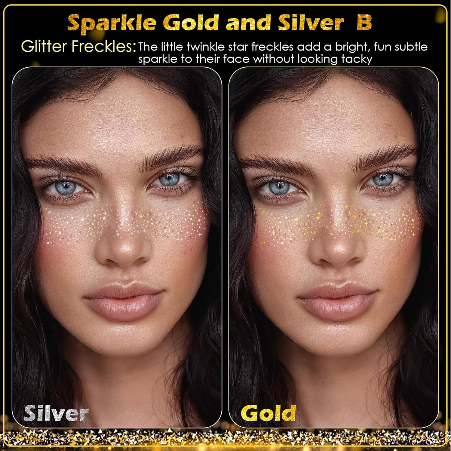 24pcs Gold and Silver Glitter Freckles Face Tattoo, Sparkle Freckles Temporary Face Tattoos, Body Face Glitter Makeup Patches Speckles, Waterproof Long Lasting Makeup Accessories for Women Girls