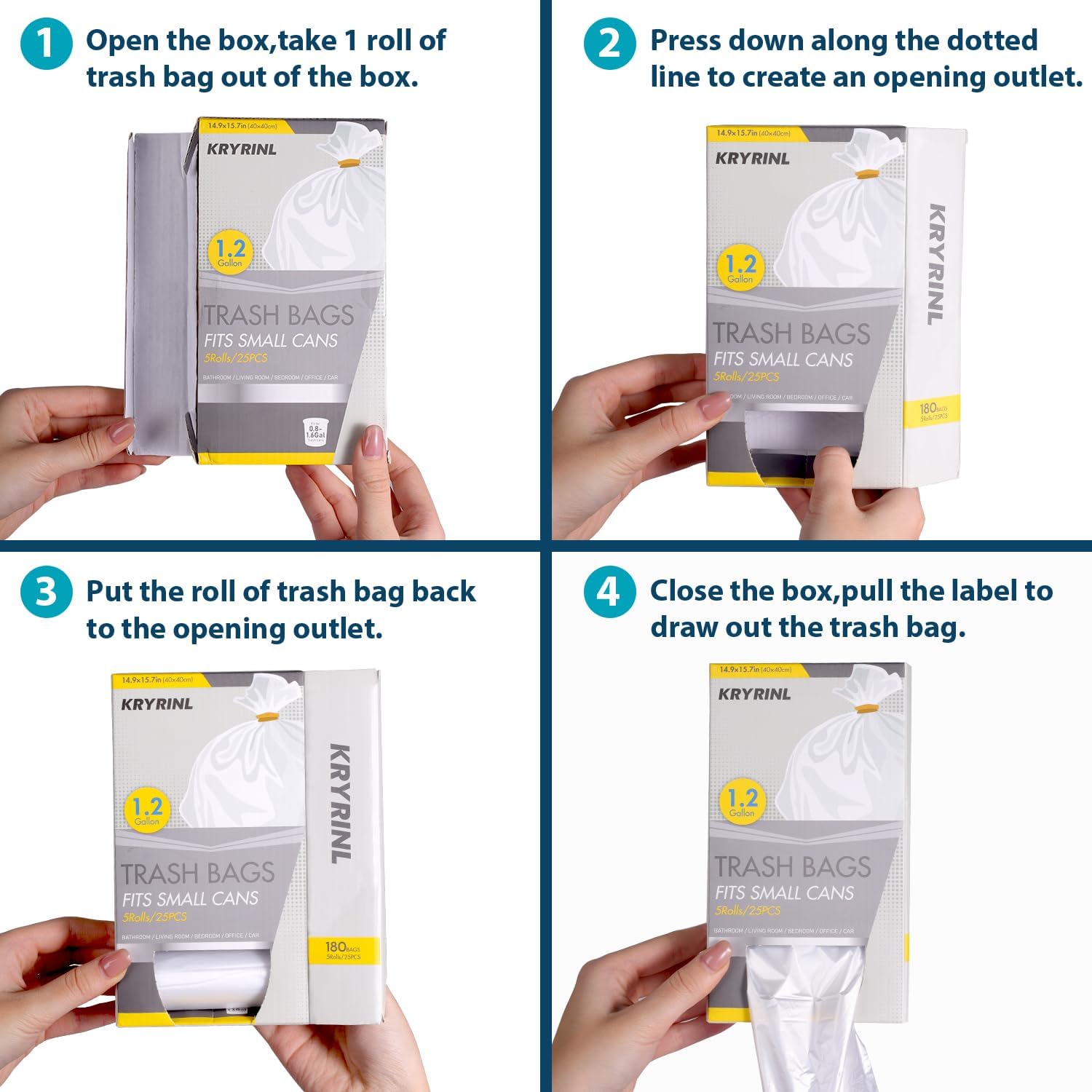 - ✅ Compact & Convenient – These 1.2-gallon mini trash bags are perfect for small spaces such as cars, offices, bathrooms, and kids' rooms, keeping your area tidy and organized.