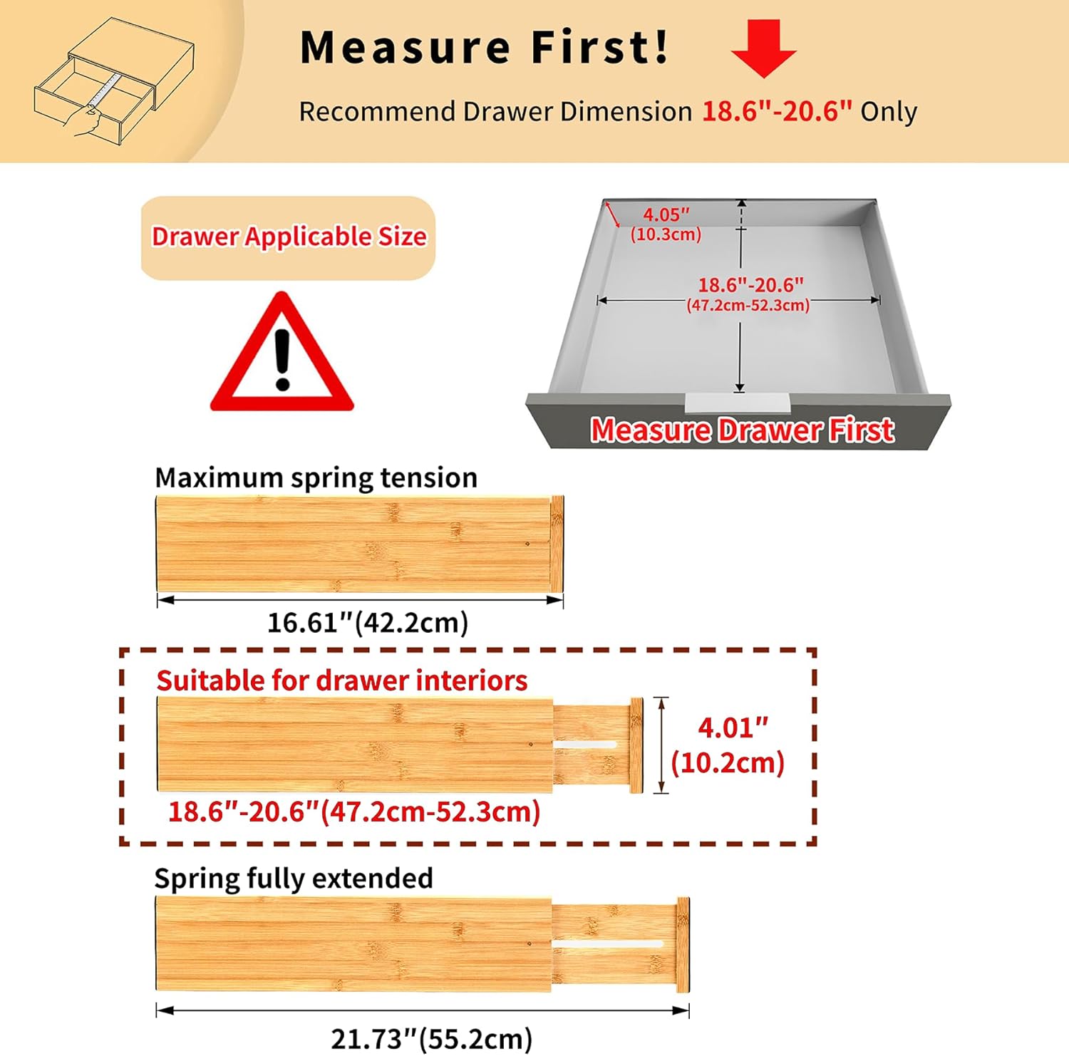 - 【Check Drawer Size Before Purchase】 **Important**: Fits drawers **18.6" to 20.6" wide (inner size only)**. If your drawer is **wider than 20.6"**, it will doesn't work. If it's **narrower than 18.6"**, the divider will be **too tight or not fit properly**. Please ensure your drawer’s inner height is greater than 4.05" for a proper fit. **Always measure before buying!**