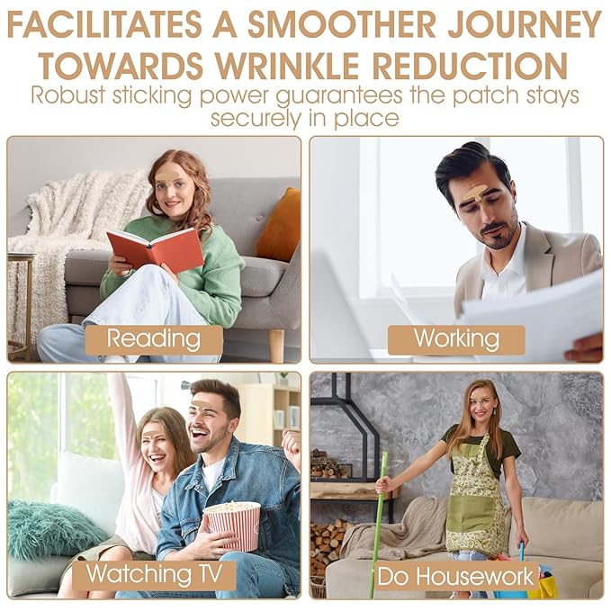 - 10 PCS Forehead Wrinkle Patches Precut Facial Patches Face Tape for Forehead Wrinkles, Frown LinesEffective Wrinkle Removal: Anti wrinkle tape for face work on the fascial layer to help relieve muscle tension, it effectively reduce the appearance of forehead wrinkles caused by staying up late, stress, aging, dehydration, collagen loss. These wrinkle tape smooths away creases and folds, leaving your complexion flawlessly smooth