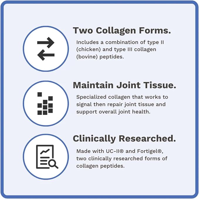 - Two forms of two clinically studied collagen peptides designed for complete joint support.